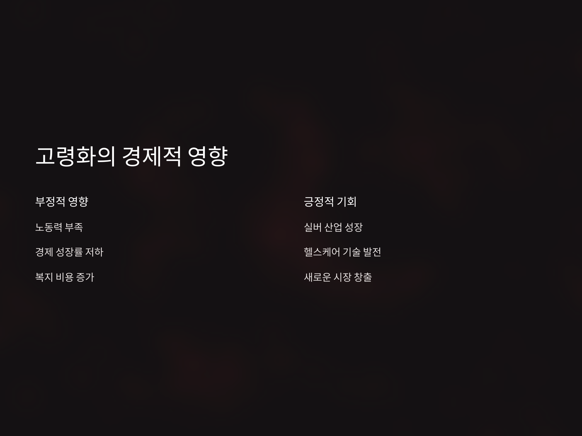 고령화는 생산가능인구(15~64세)의 감소로 인해 노동력이 부족해지고, 이에 따른 경제 성장률 저하가 예상됩니다. 동시에 노인복지와 연금 시스템에 대한 비용 부담이 증가하며, 국가 재정에 압박을 가합니다.