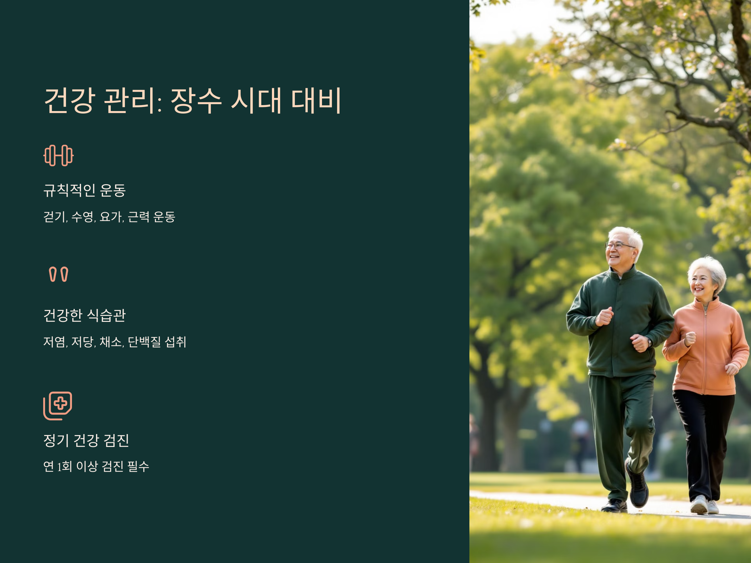 건강은 노후 생활의 질을 결정짓는 핵심 요소입니다. 아무리 재정 준비가 잘 되어 있더라도 건강이 따라주지 않는다면 행복한 노후를 보낼 수 없습니다.