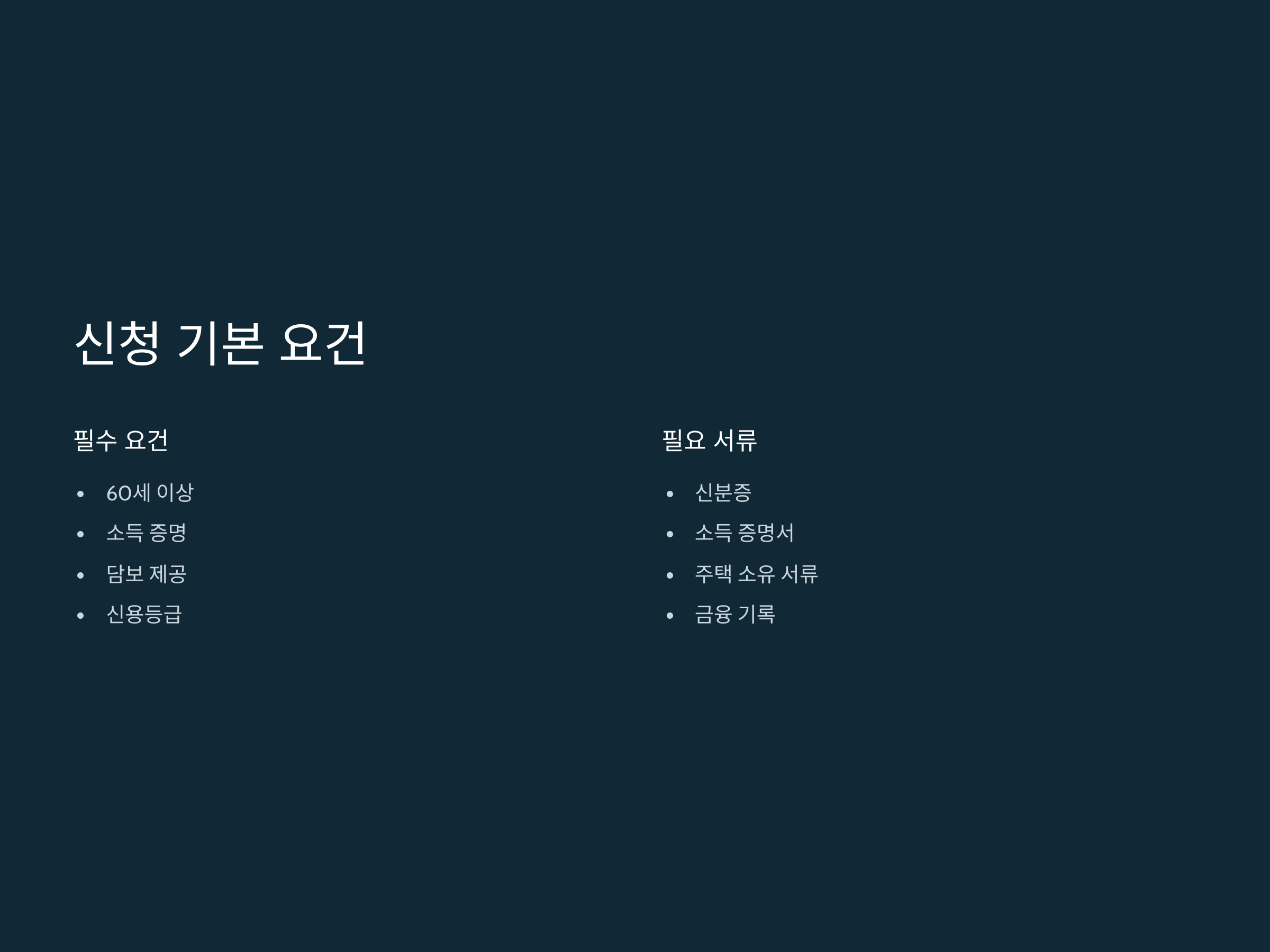 - 나이: 대개 60세 이상(은행에 따라 다를 수 있음).
