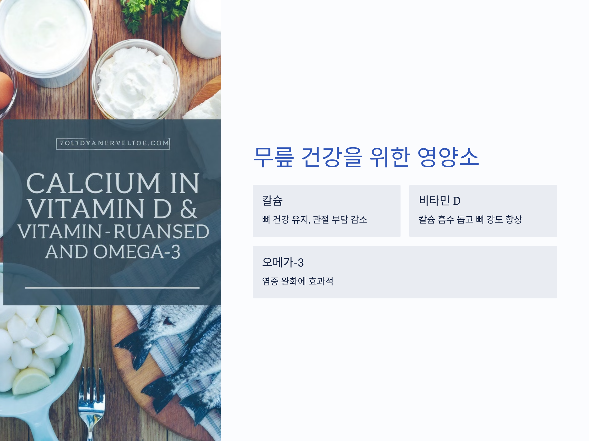 - 칼슘: 뼈 건강을 유지하며 관절 부담을 줄입니다.