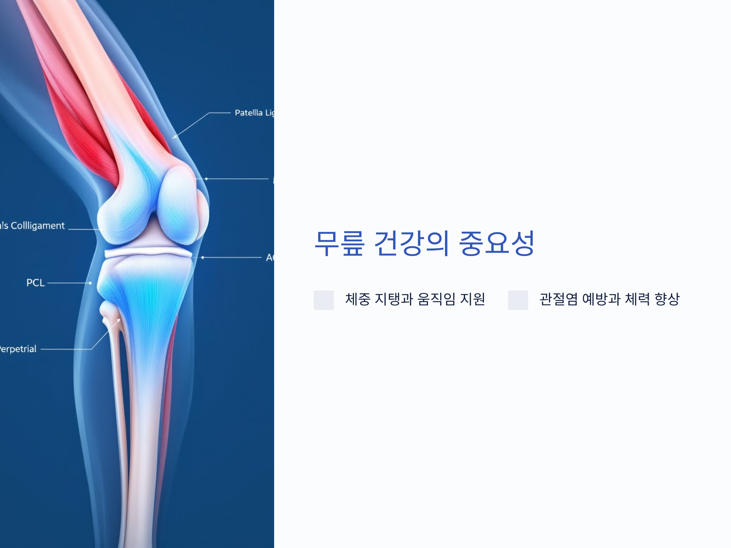 무릎은 체중을 지탱하며 움직임을 지원하는 중요한 역할을 합니다. 무릎 건강이 약화되면 생활의 질이 크게 저하될 뿐만 아니라, 장기적으로는 관절염이나 연골 손상 같은 심각한 문제로 이어질 수 있습니다. 특히 앉아 있는 시간이 길어지면서 근육 사용이 줄어들고, 이로 인해 무릎 주변 근육의 약화가 가속화됩니다.