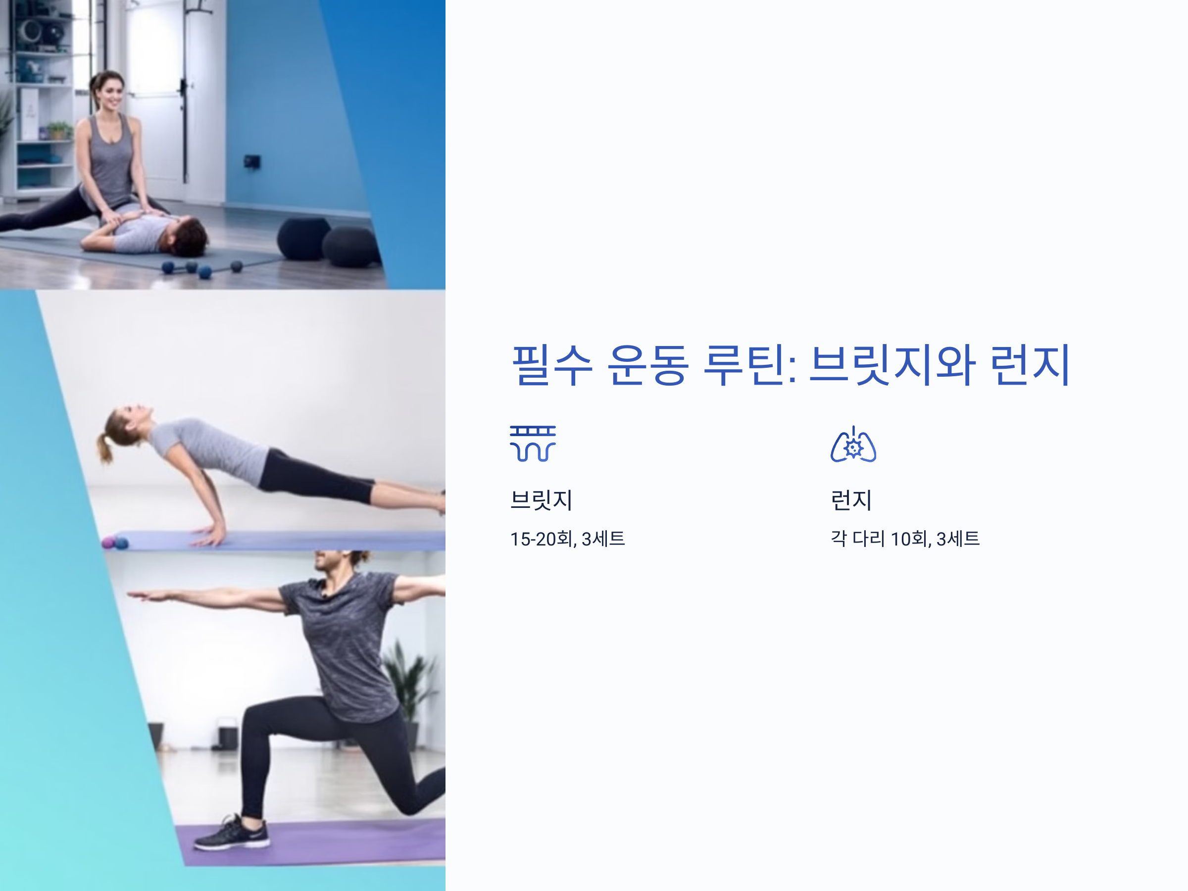 - 효과: 둔근 강화 및 허리 안정성 향상