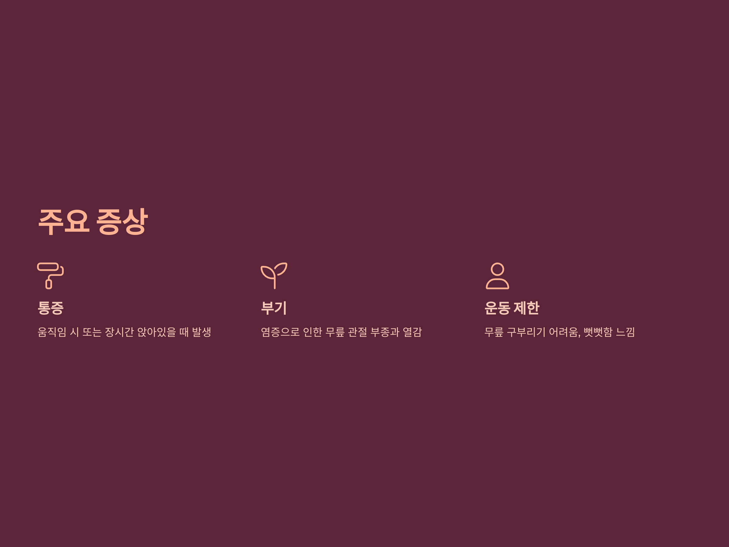 - 통증: 무릎을 움직일 때 또는 장시간 앉아 있으면 통증이 발생할 수 있습니다.