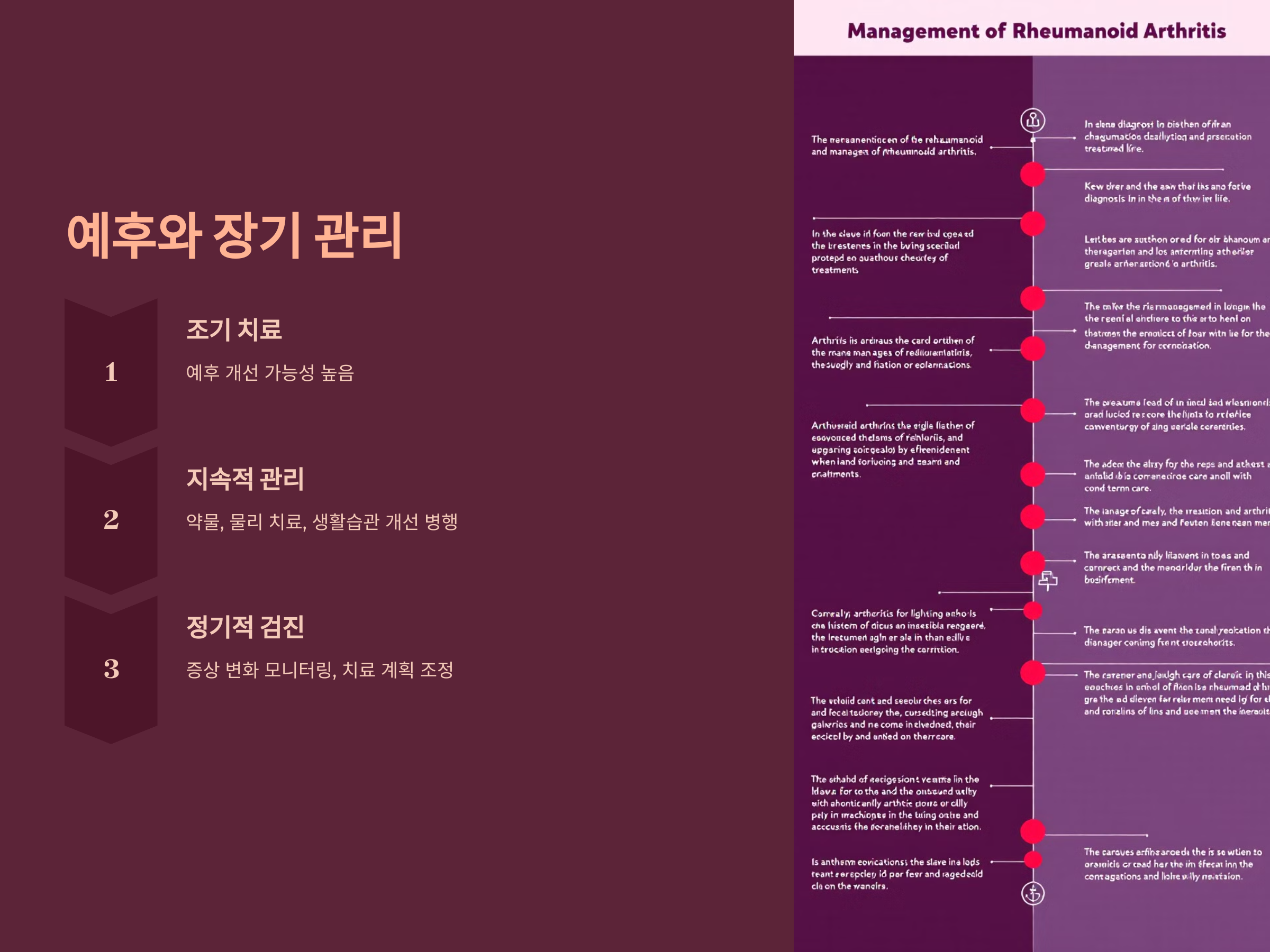 류마티스 관절염은 조기에 치료를 시작하면 예후가 좋아질 수 있습니다. 하지만 시간이 지나면서 관절의 손상이 누적되면 치료가 어려워질 수 있기 때문에, 초기 증상에 대해 적극적으로 대응하는 것이 중요합니다. 약물 치료와 물리 치료, 그리고 생활 습관의 개선을 통해 증상을 효과적으로 관리할 수 있습니다.