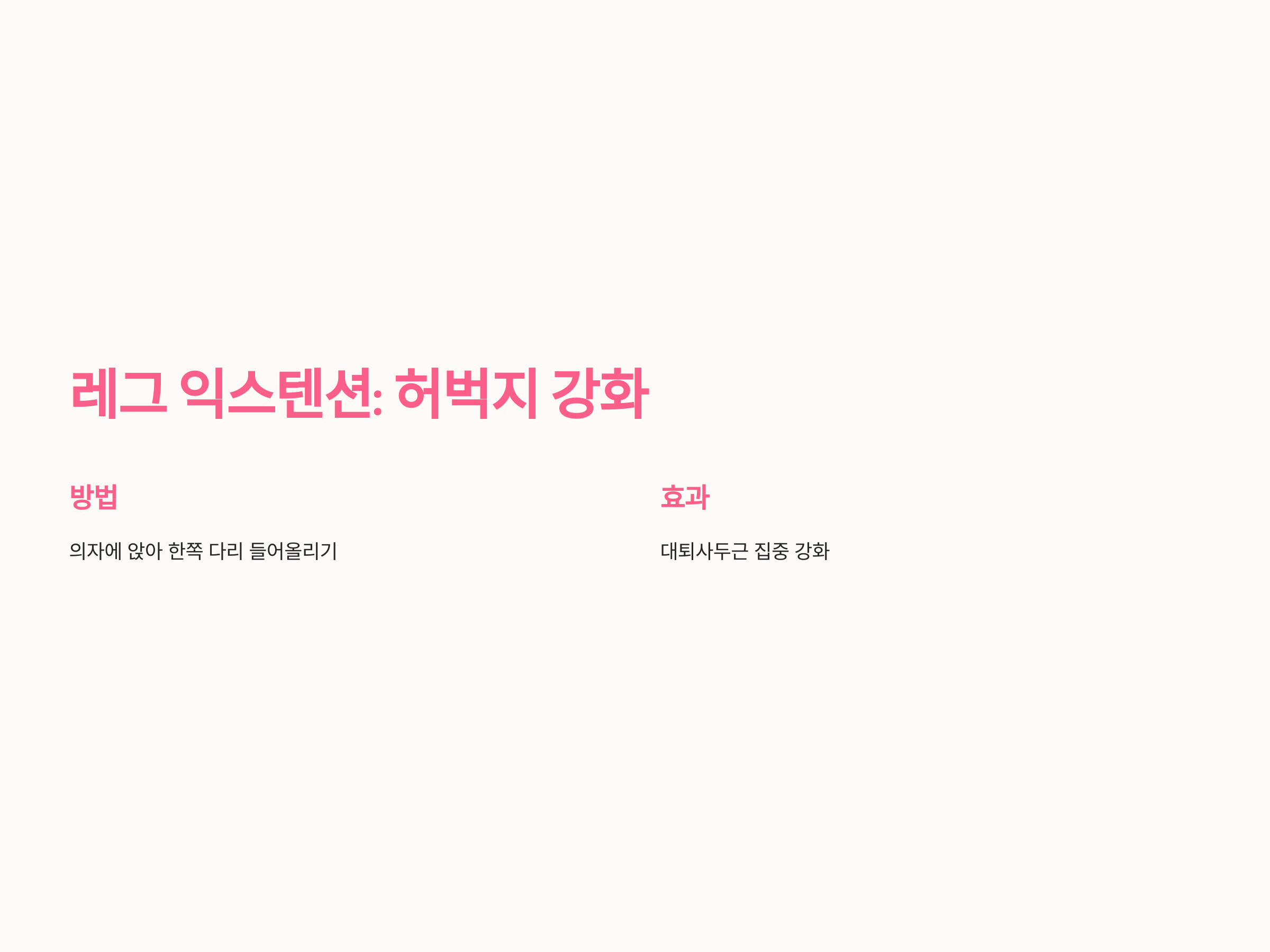 - 천천히 다리를 내리며 반대쪽도 동일하게 반복합니다.