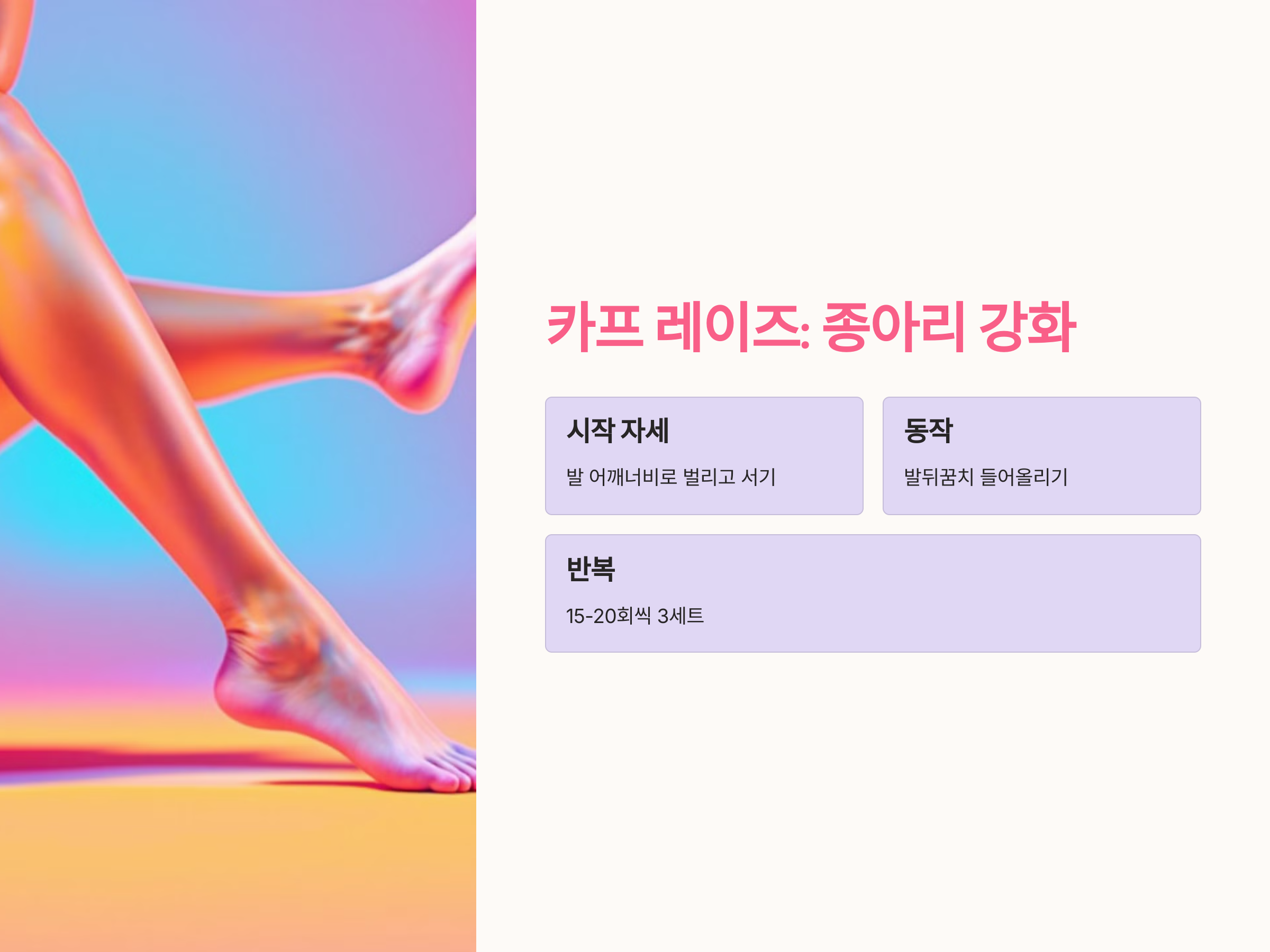 - 벽이나 의자를 잡고 균형을 유지하며 반복합니다.