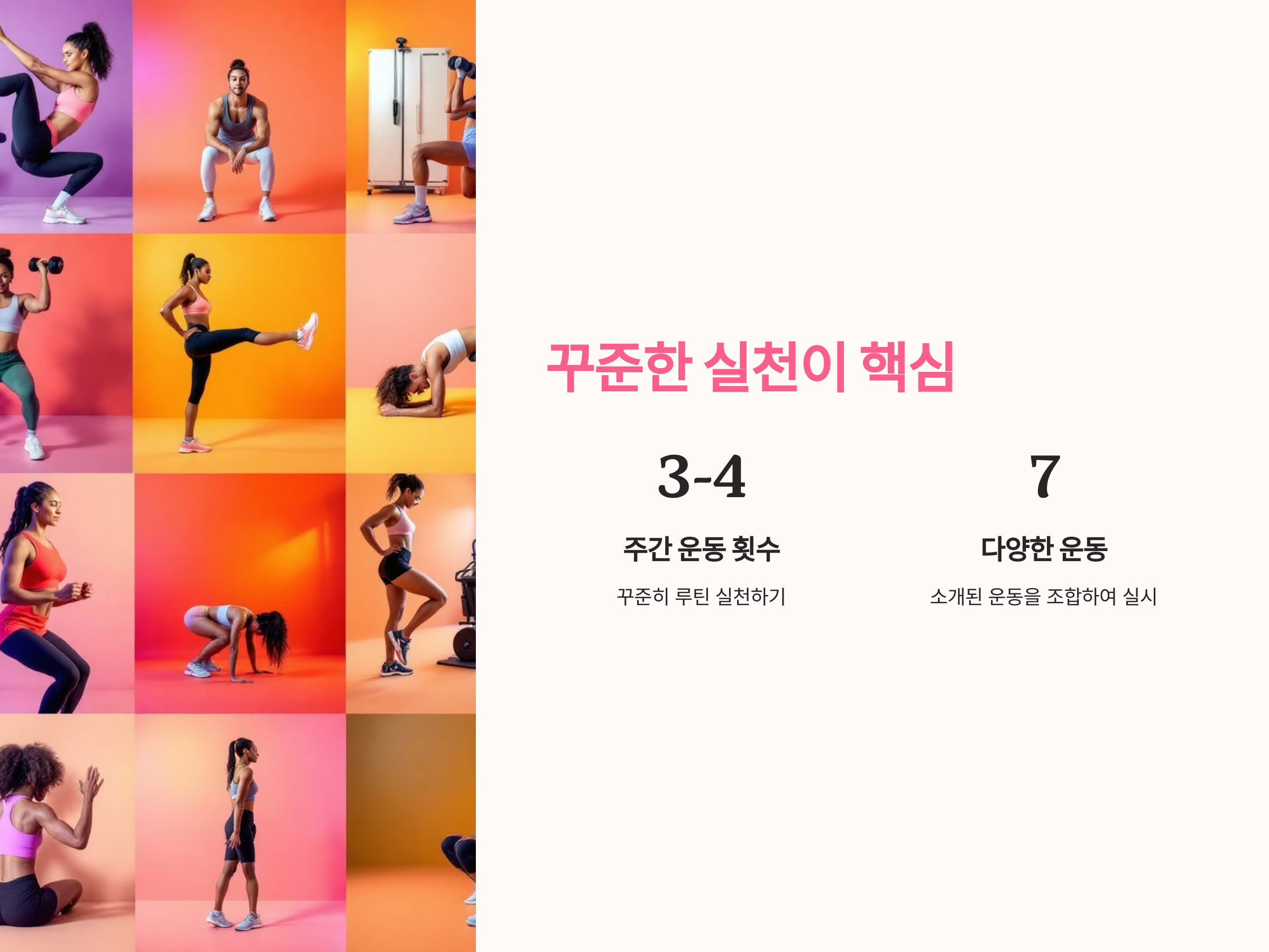 - 초보자는 10~15회씩 2~3세트로 시작하고, 점차 횟수를 늘려갑니다.