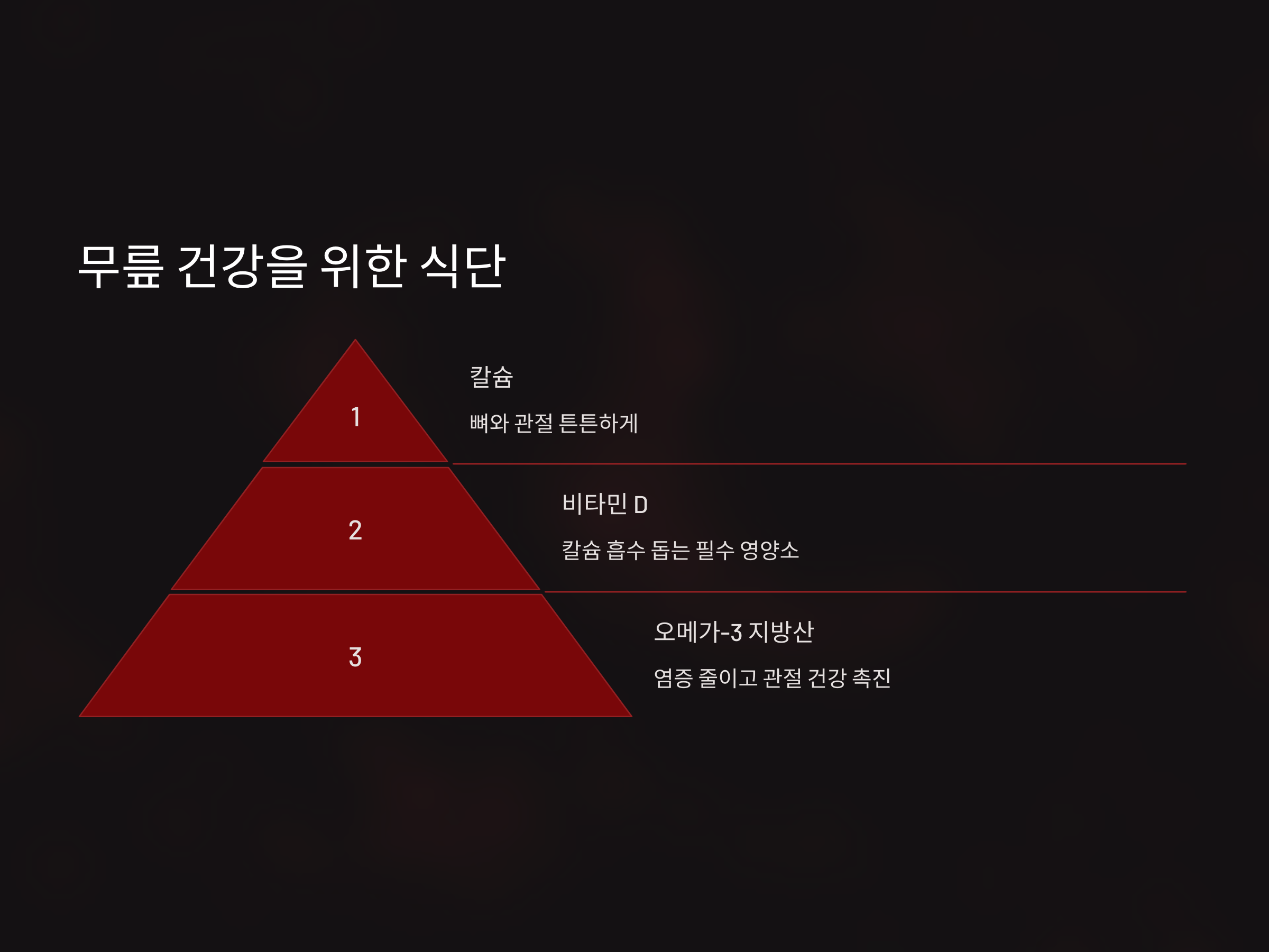 - 칼슘: 뼈와 관절을 튼튼하게 함. 우유, 치즈, 두부에 풍부.