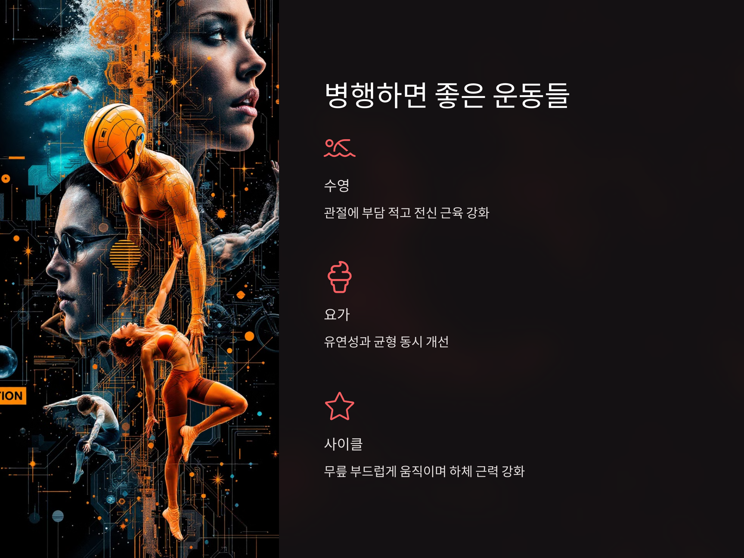 - 수영: 관절에 부담이 적고 전신 근육을 강화합니다.