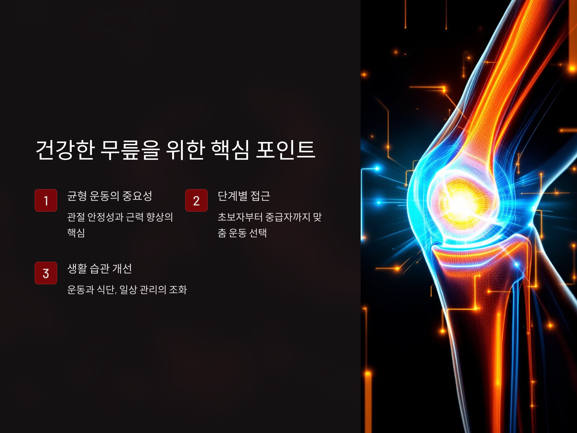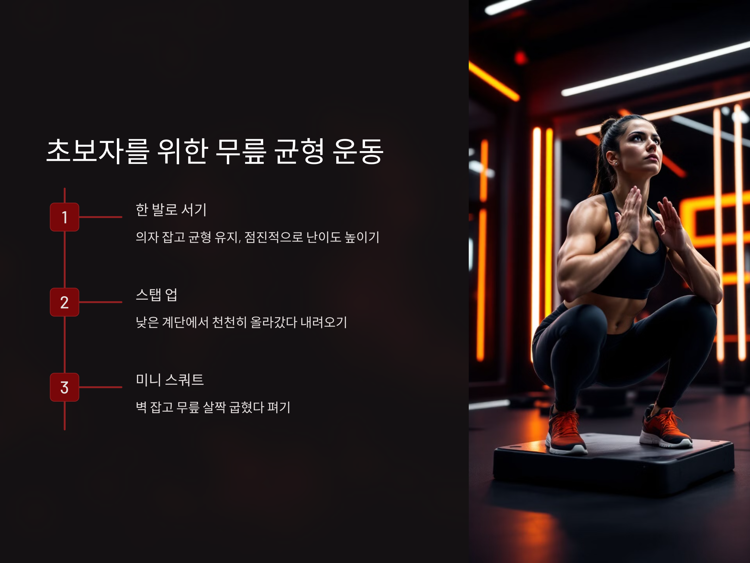 이 운동들은 균형 운동의 효과를 극대화하며 무릎 건강을 종합적으로 지원합니다.