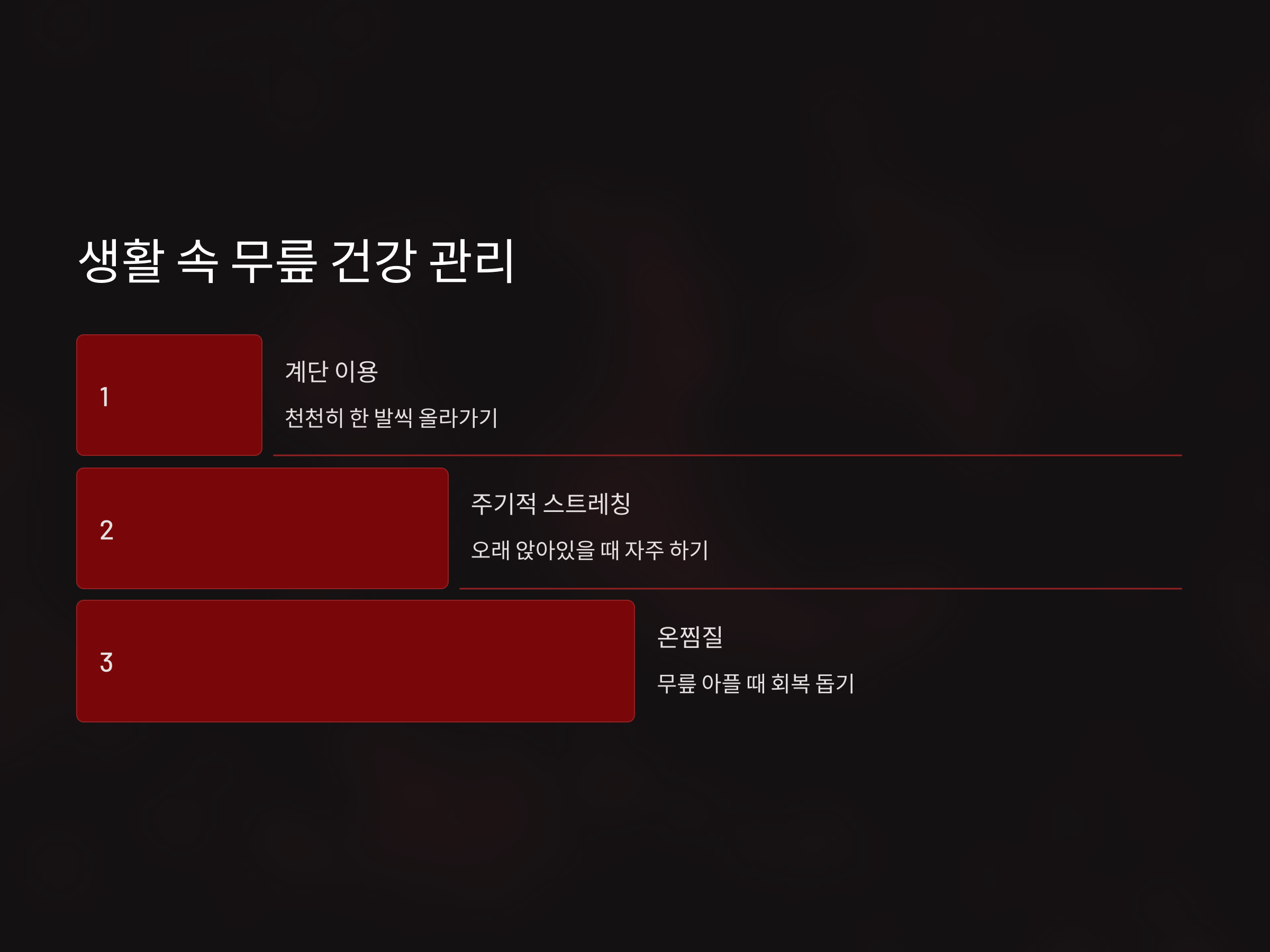 운동 시간 외에도 생활 속 작은 실천으로 무릎 건강을 유지할 수 있습니다.