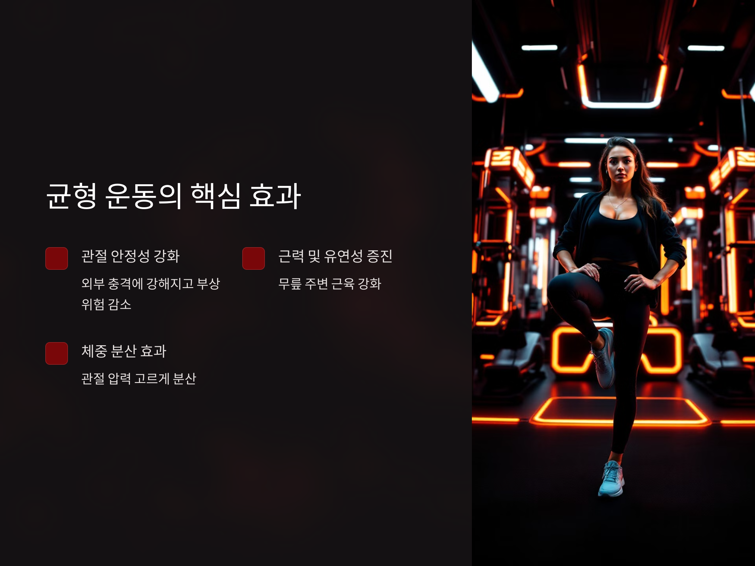무릎 건강은 균형과 근육의 상호작용에서 출발합니다. 꾸준한 연습이 필요하며, 자세 교정도 병행하면 더욱 좋습니다.