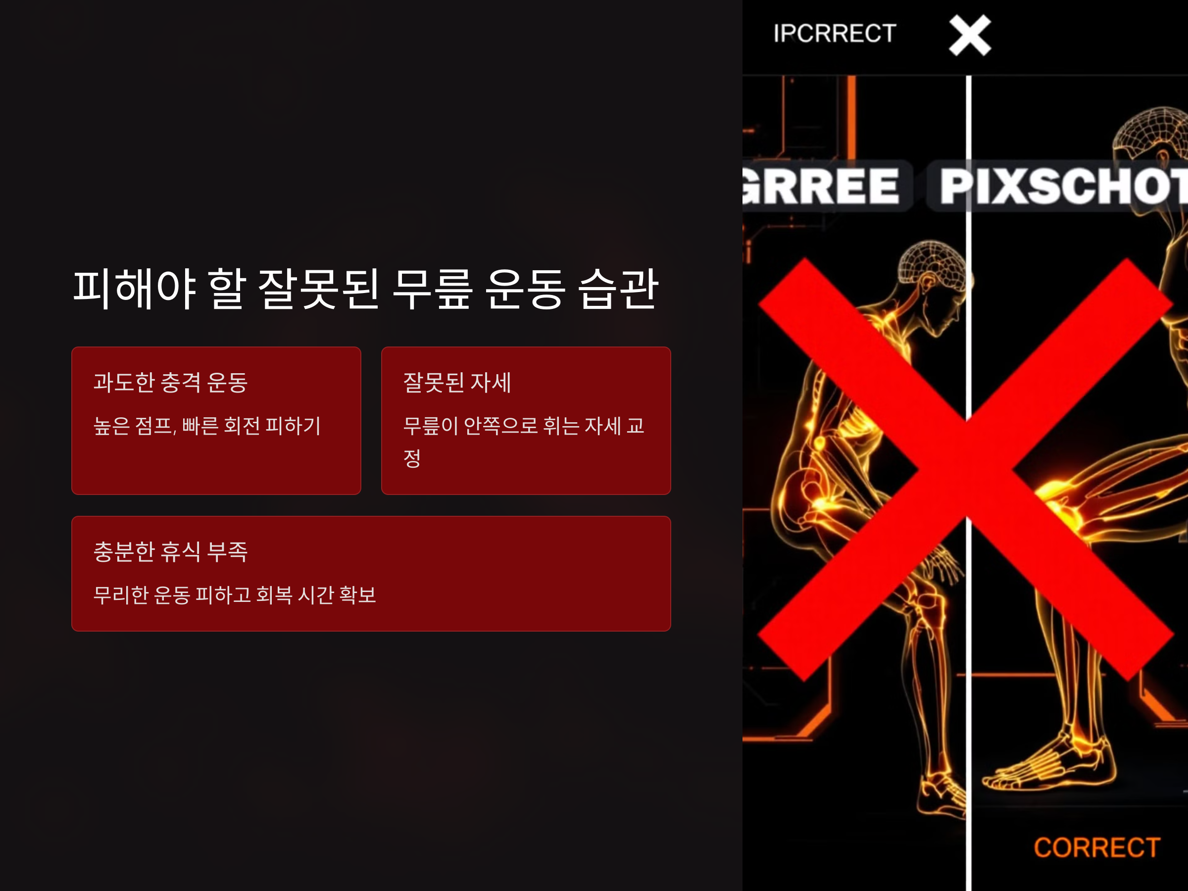 - 너무 높은 점프나 빠른 회전 운동: 무릎 관절에 과도한 부하를 줍니다.