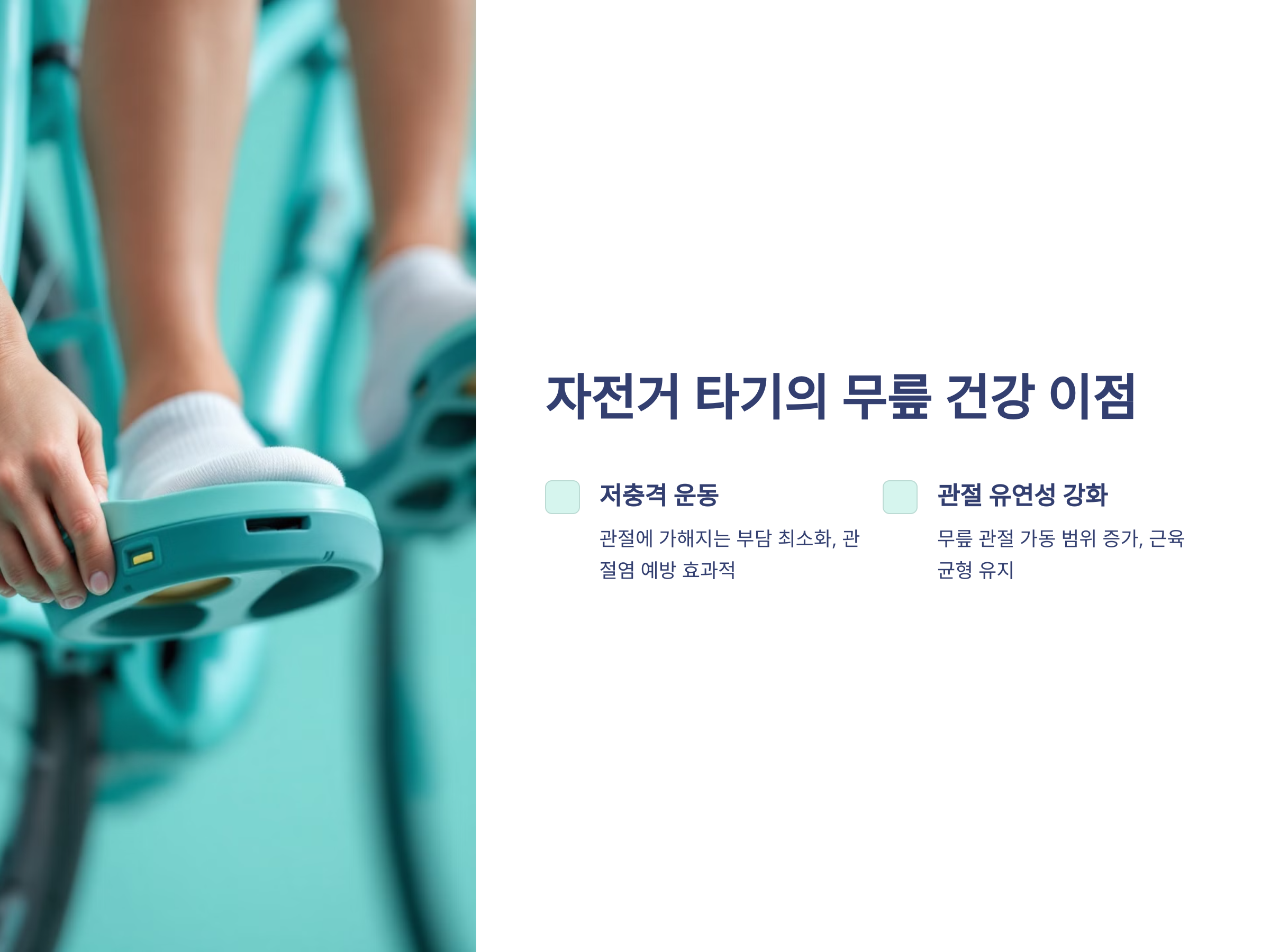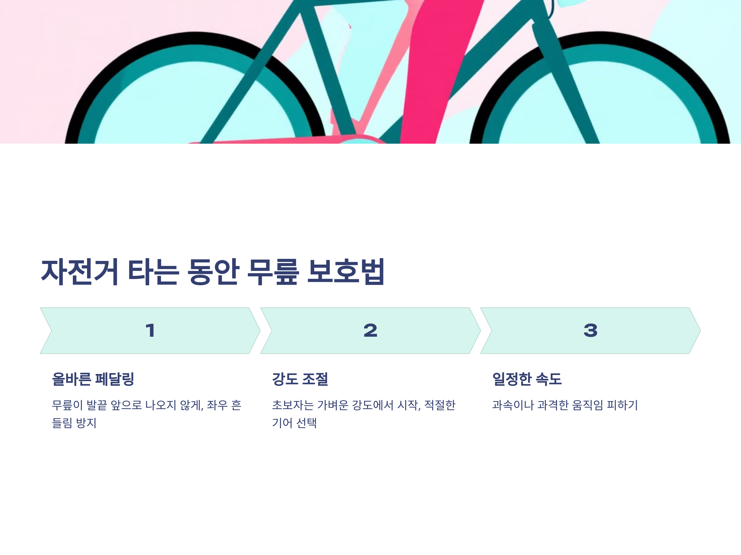 - 운동 과부하: 무리한 강도로 오랜 시간 타면 관절에 무리가 갑니다.