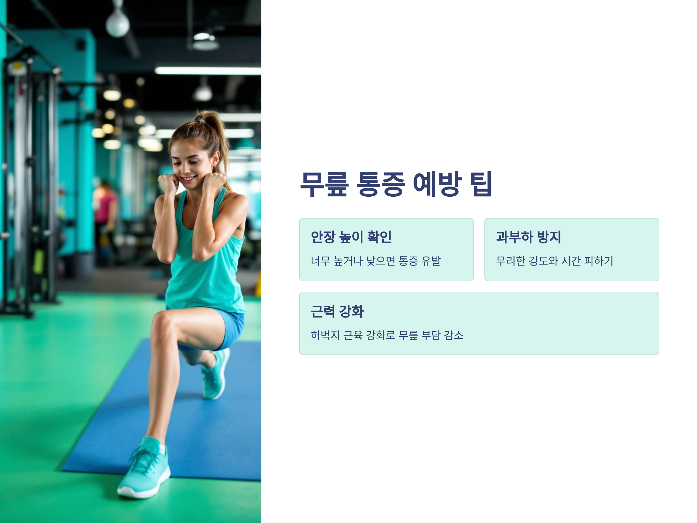 - 근력 부족: 허벅지 근육이 약하면 무릎에 부담이 더 실립니다.