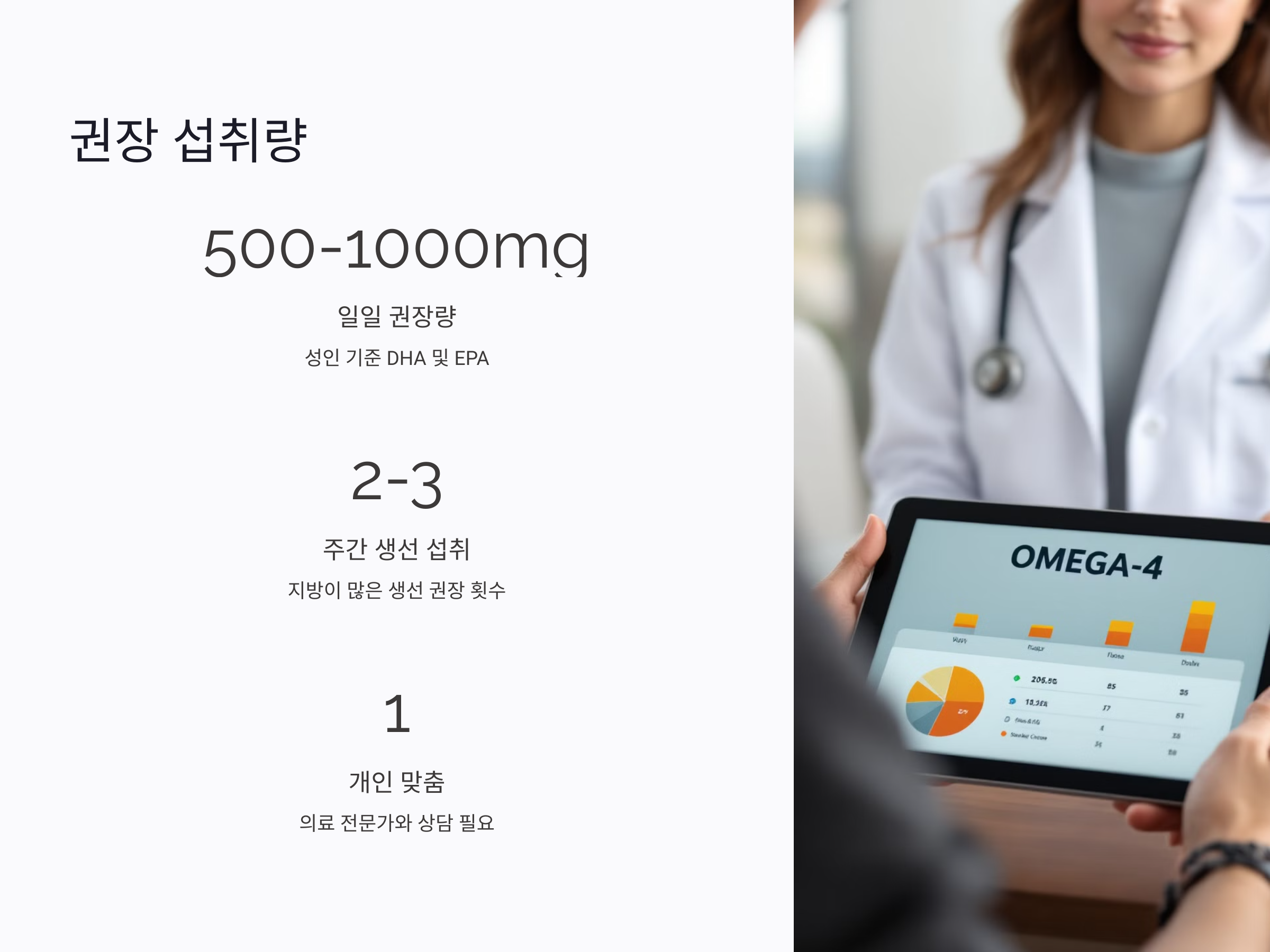 오메가-3의 권장 섭취량은 연령, 성별, 건강 상태에 따라 다를 수 있습니다. 일반적으로 성인의 경우 하루 500~1,000mg의 DHA 및 EPA를 섭취하는 것이 권장됩니다. 무릎 통증 완화를 목적으로 하는 경우, 의료 전문가와 상담하여 개인의 상황에 맞는 섭취량을 결정하는 것이 중요합니다.