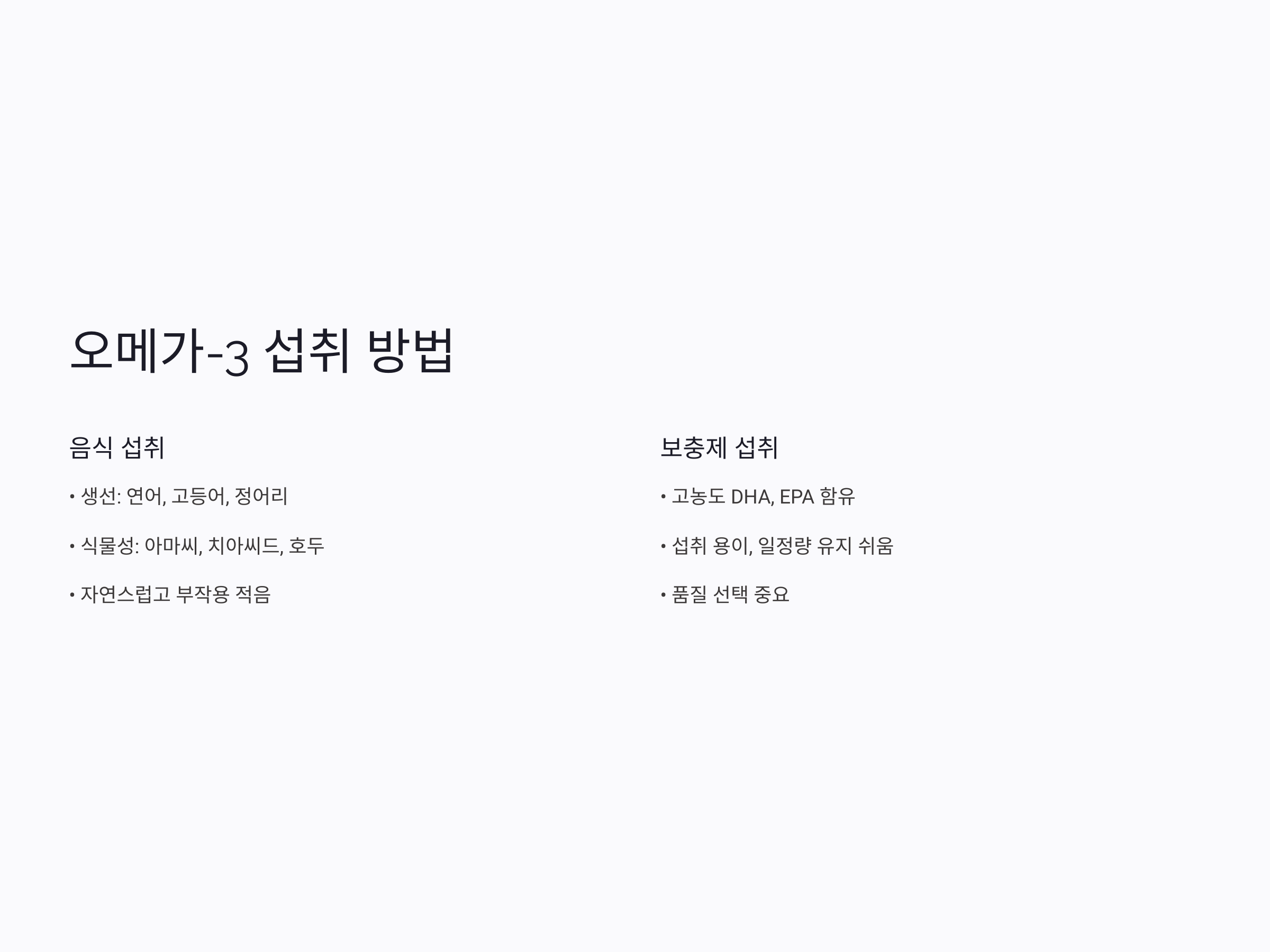 연어, 고등어, 정어리 등 지방이 많은 생선은 오메가-3의 풍부한 공급원입니다. 또한 아마씨, 치아씨드, 호두 같은 식물성 식품에서도 오메가-3를 섭취할 수 있습니다. 음식을 통한 섭취는 자연스럽고 부작용이 적은 장점이 있지만, 꾸준히 권장량을 채우기 어렵다는 단점이 있습니다.