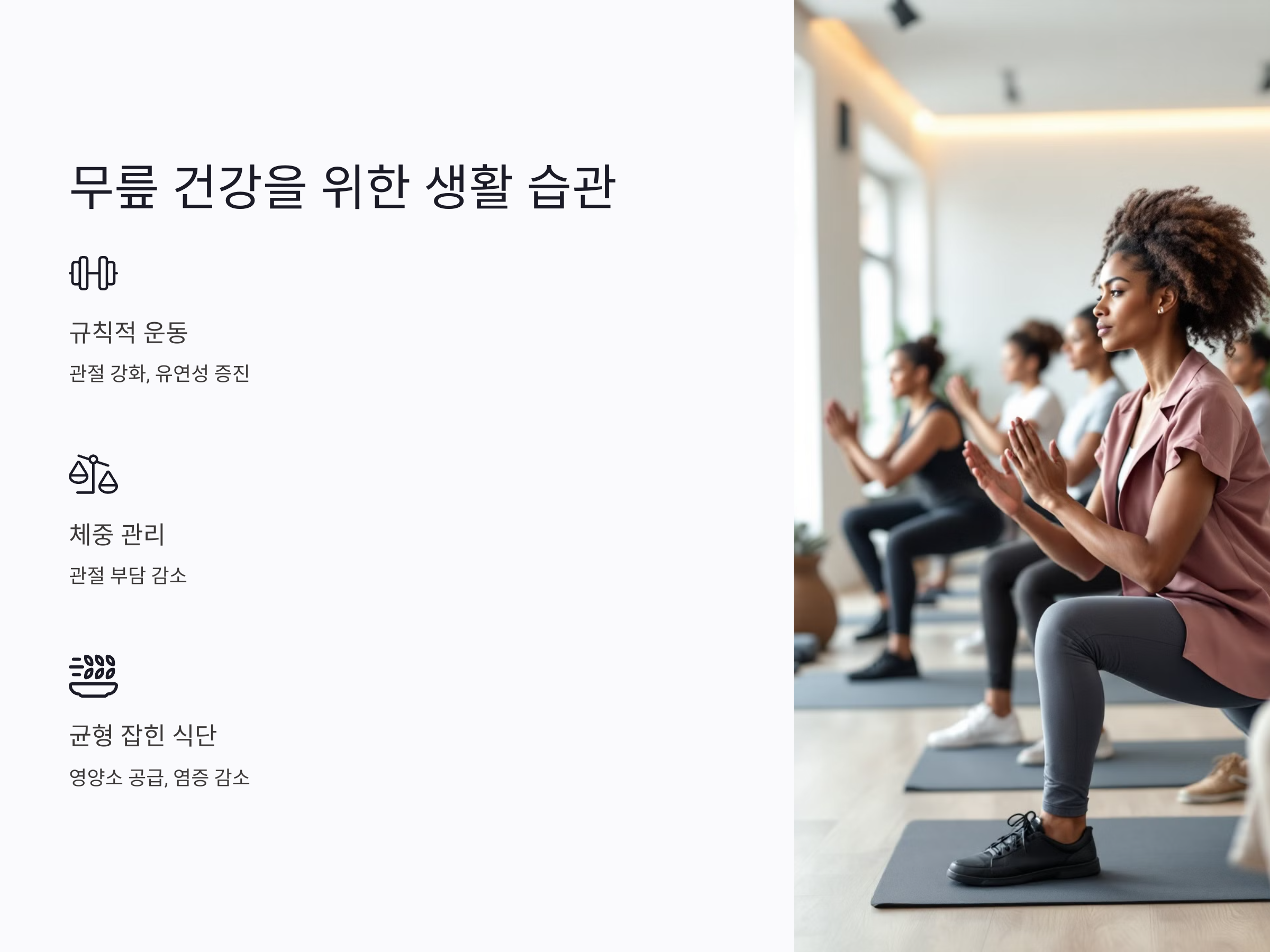 특히 무릎 관절에 무리가 가는 동작은 피하고, 체중 관리와 근력 운동을 통해 관절 보호를 강화해야 합니다.