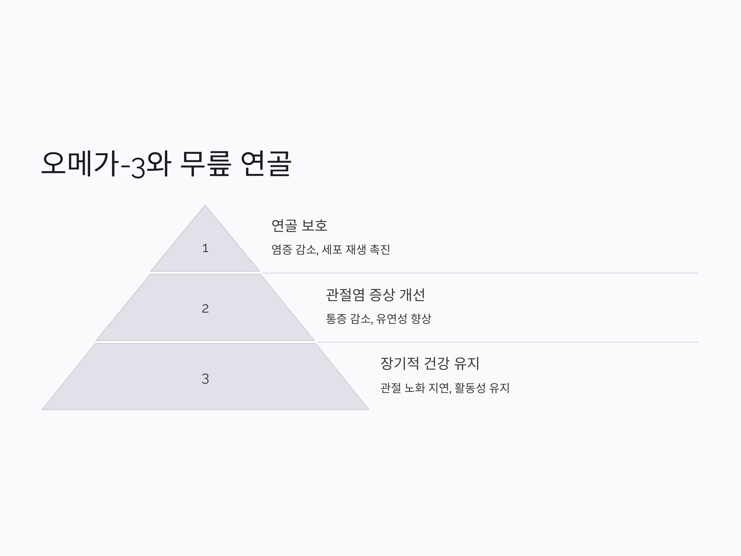 연골은 관절의 완충 역할을 하며, 무릎 건강에 있어 중요한 역할을 합니다. 그러나 나이가 들거나 무리한 활동으로 인해 연골이 닳게 되면 관절염과 같은 문제가 발생할 수 있습니다. 오메가-3는 연골의 염증을 줄이고, 세포 재생을 촉진하여 연골을 보호하는 데 도움을 줍니다.