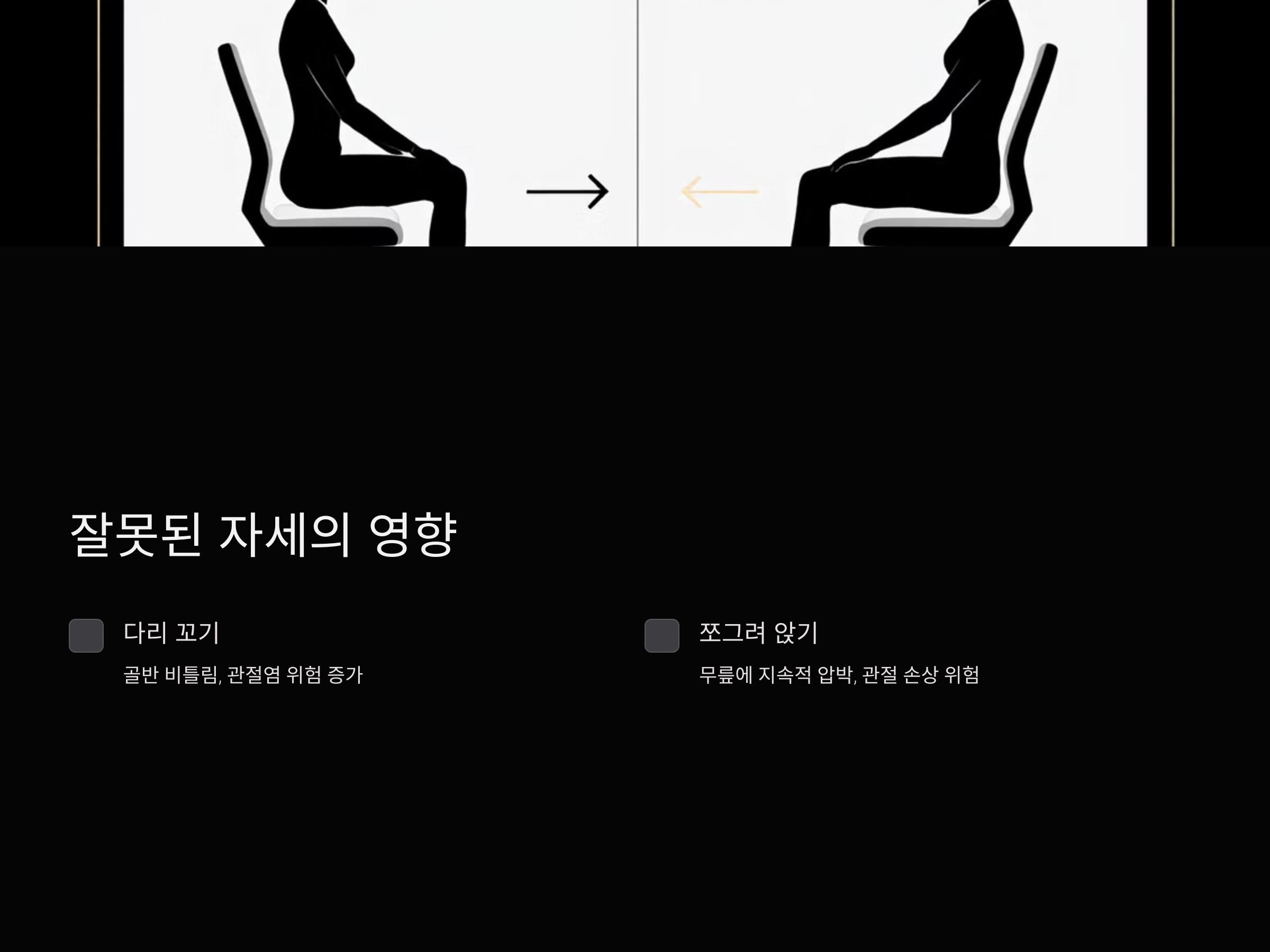 - 굽은 허리로 앉기: 허리를 구부정하게 앉으면 무릎과 척추에 연쇄적인 영향을 미칩니다.