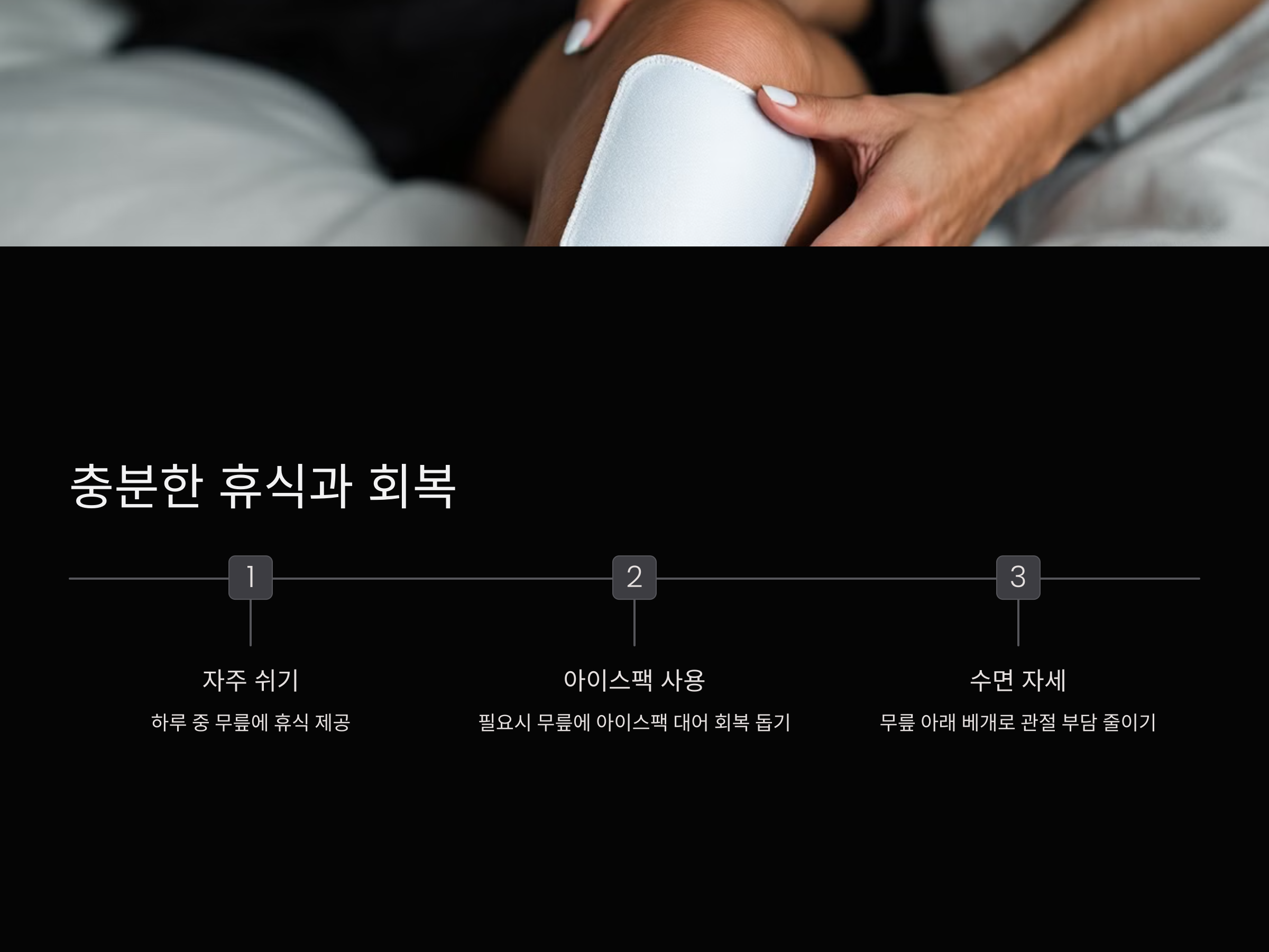 - 하루 중 무릎을 자주 쉬게 하고, 필요할 때는 무릎에 아이스팩을 대며 회복을 돕습니다.