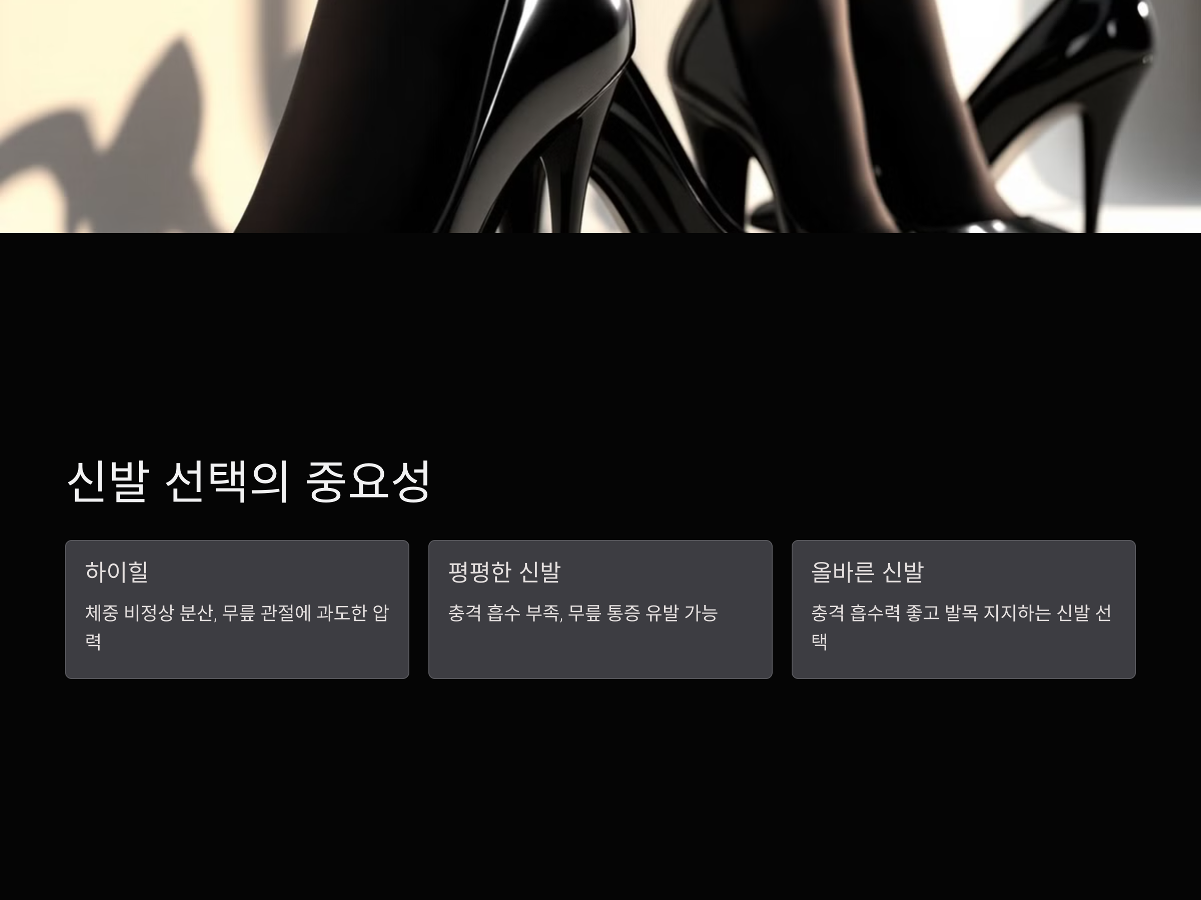 - 굽이 너무 높은 하이힐: 하이힐은 걸을 때 체중을 비정상적으로 분산시켜 무릎 관절에 과도한 압력을 가합니다.