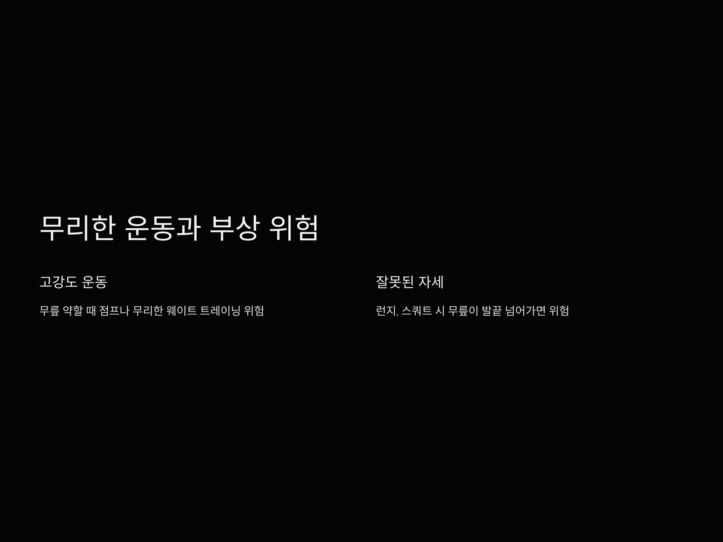 - 운동 전 충분히 스트레칭을 하고, 무릎 주변 근육을 강화하는 데 초점을 둡니다.