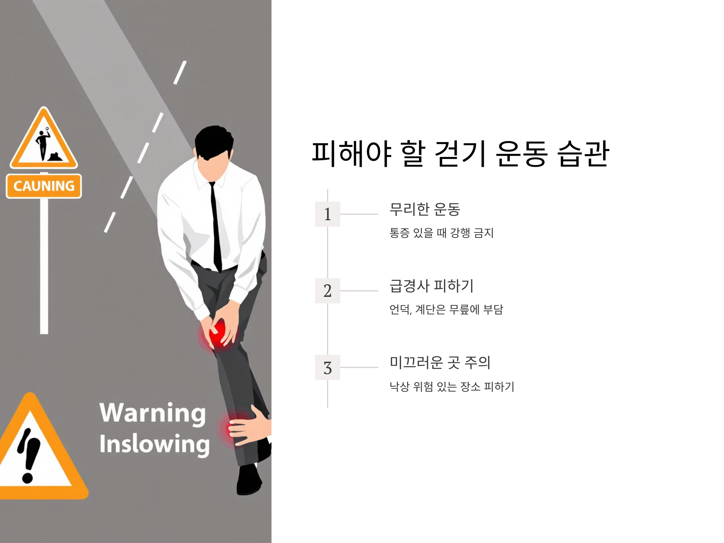 걷기 운동을 통해 무릎 건강을 지키기 위해서는 피해야 할 행동도 있습니다.