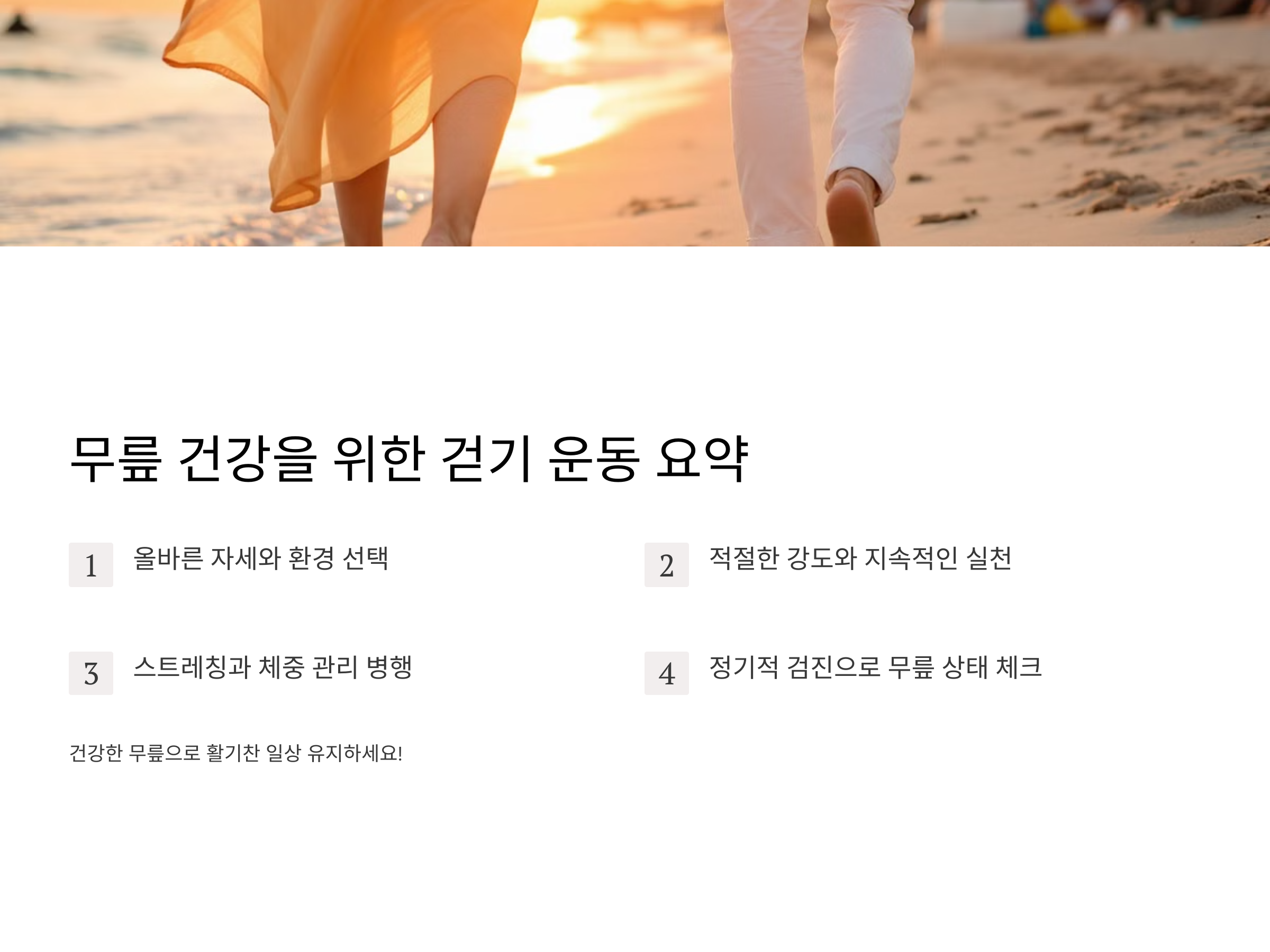무릎에 적합한 걷기 운동은 올바른 자세와 환경 조성을 통해 더욱 효과적으로 수행할 수 있습니다. 걷기 전후 스트레칭과 주기적인 점검을 통해 무릎 건강을 지키며, 체중 관리와 적절한 강도의 운동을 병행하면 오랜 시간 건강한 삶을 누릴 수 있습니다. 이 모든 과정을 통해 걷기 운동이 선사하는 다양한 혜택을 직접 경험해 보세요.
