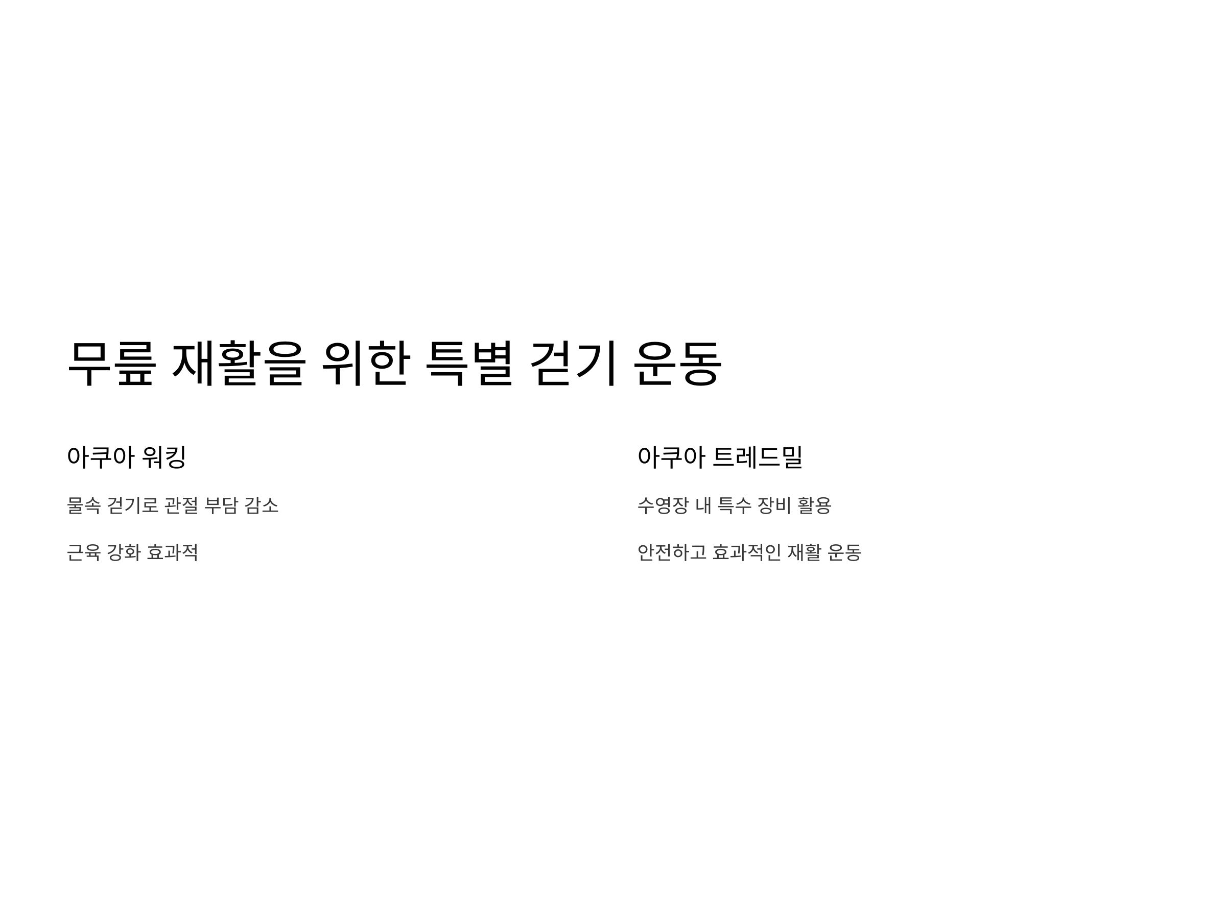 무릎 부상에서 회복 중이라면 재활에 적합한 걷기 운동을 시도해 보세요. 물속에서 걷는 아쿠아 워킹은 관절에 부담을 덜 주면서도 효과적으로 근육을 강화합니다. 수영장이나 아쿠아 트레드밀을 이용하면 더욱 안전하게 운동할 수 있습니다.
