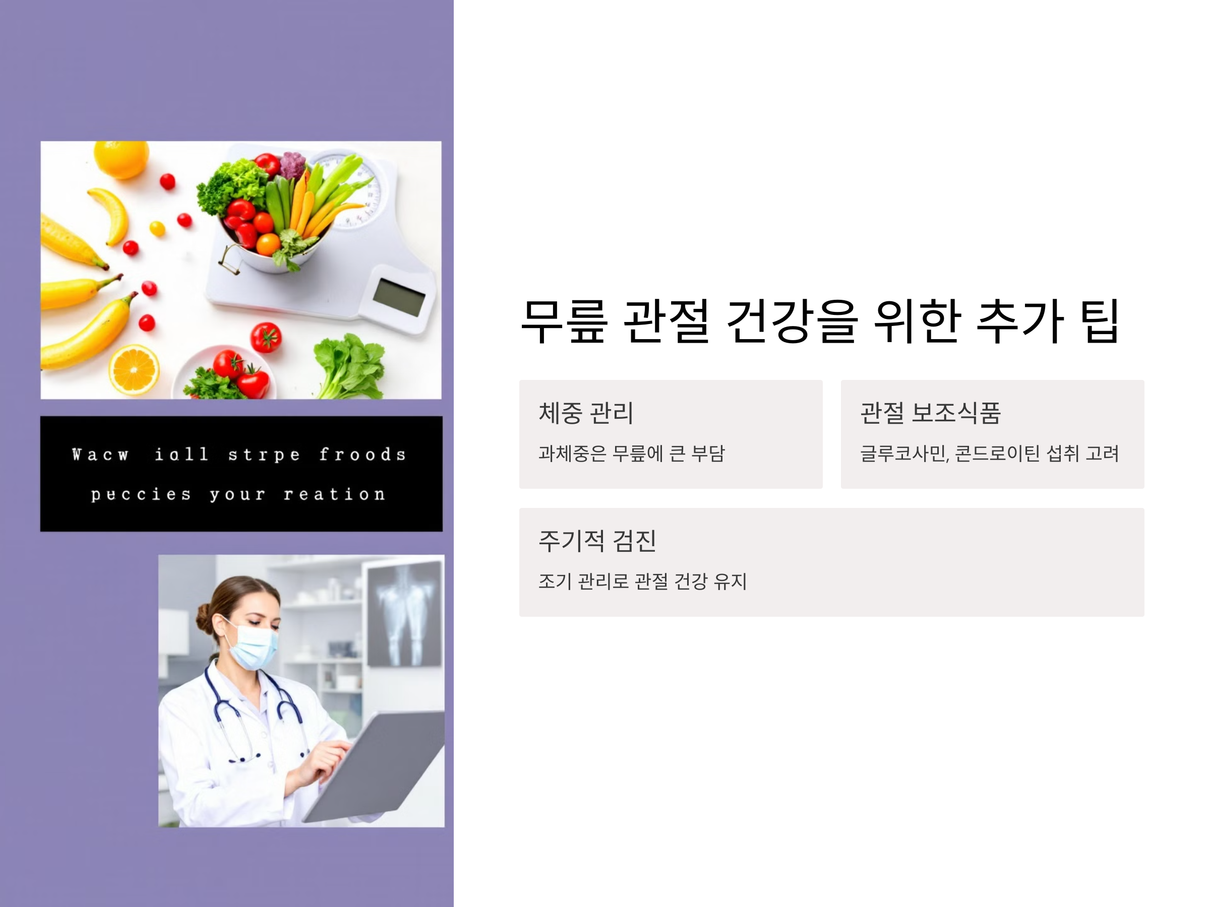 과체중은 무릎에 큰 부담을 줄 수 있으므로 건강한 체중을 유지하세요.