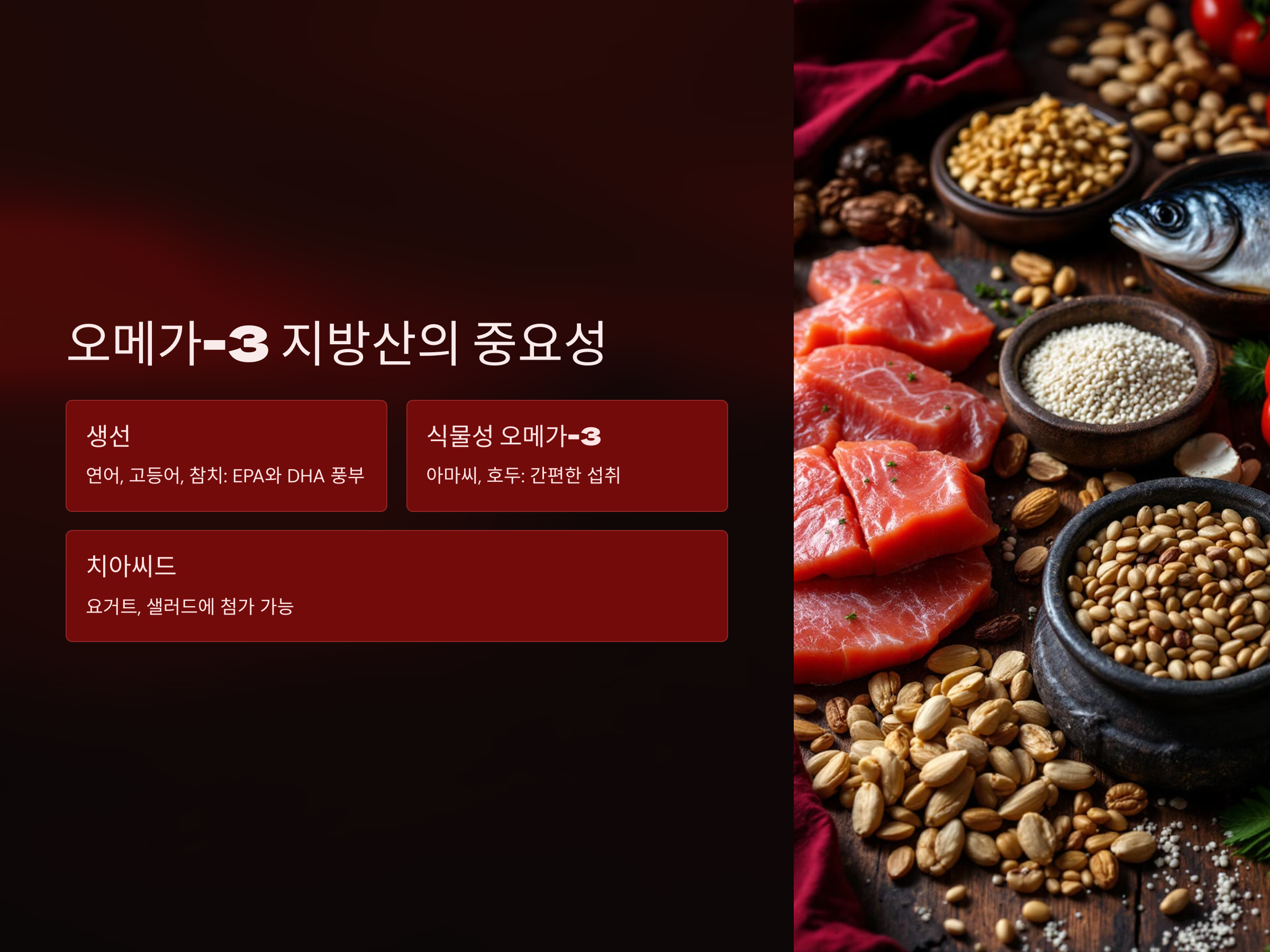 - 아마씨와 호두: 식물성 오메가-3 공급원으로 간편하게 추가할 수 있습니다.