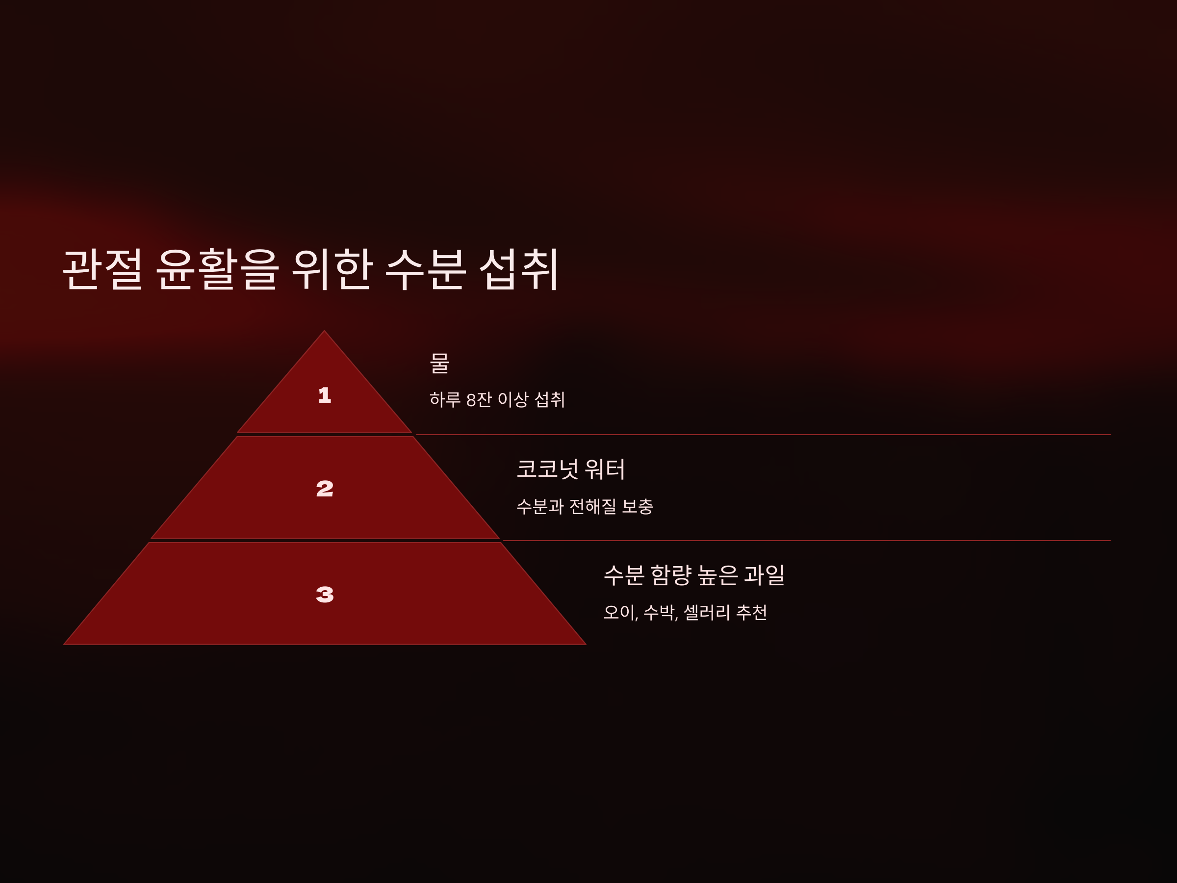 - 물: 하루 최소 8잔 이상 섭취하세요.