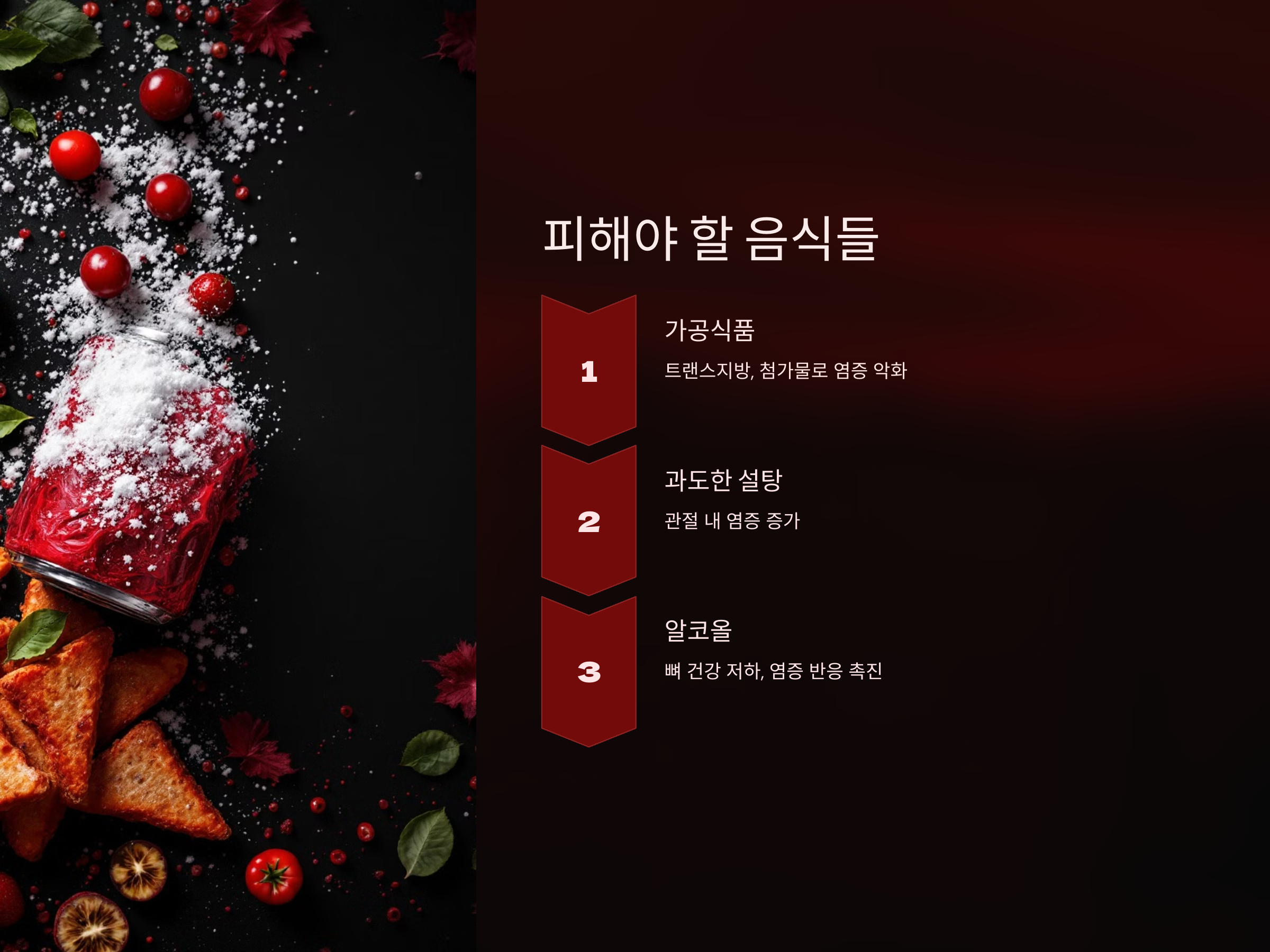 - 가공식품: 트랜스지방과 첨가물이 들어간 음식은 염증을 악화시킵니다.