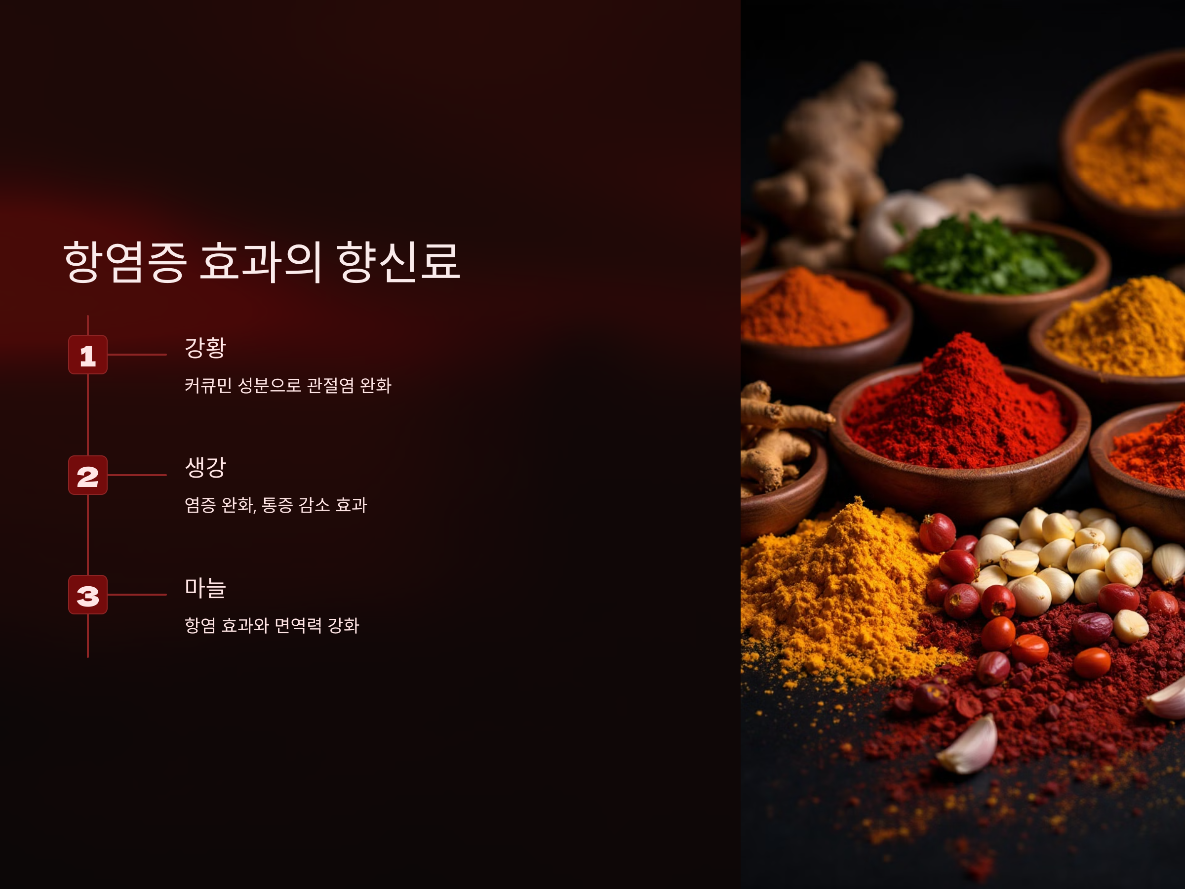 - 마늘: 항염 효과와 면역력을 강화하는 데 도움을 줍니다.