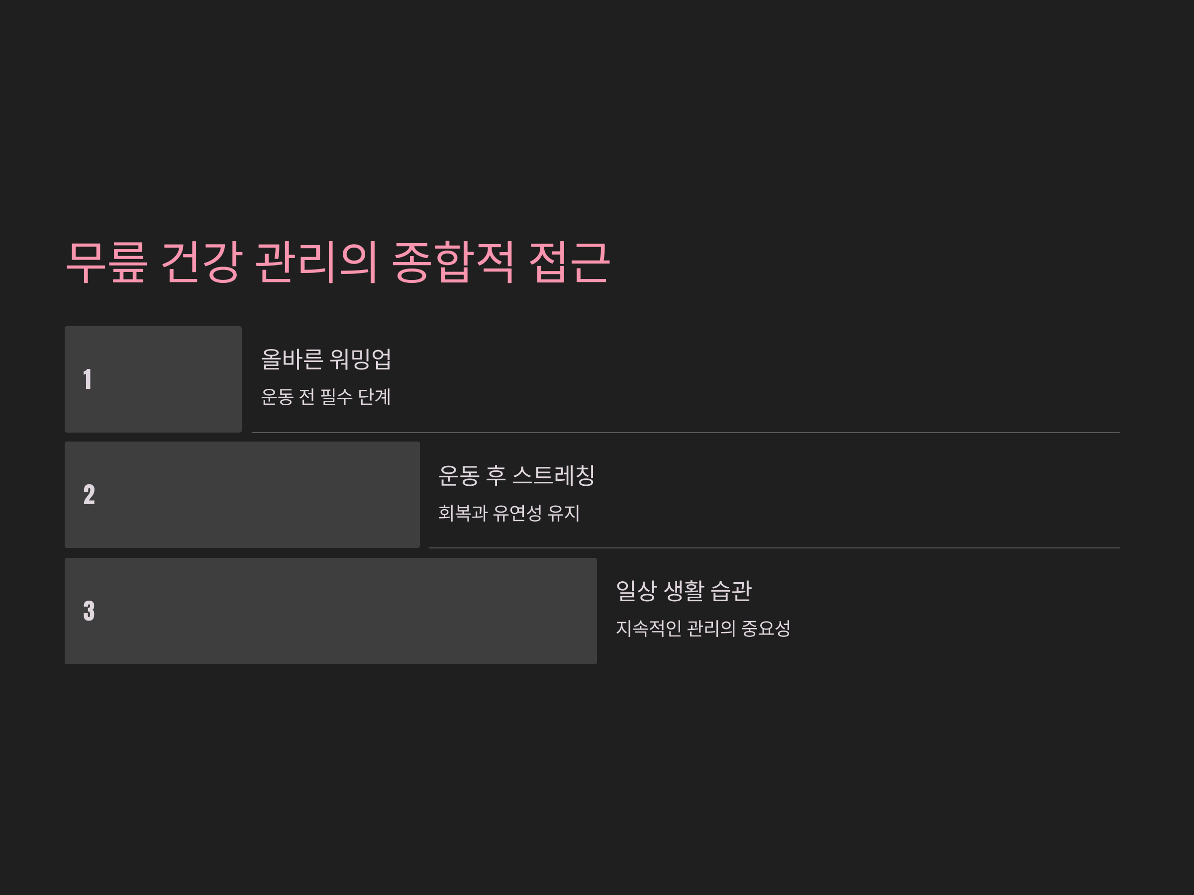 무릎 건강은 단순한 운동 준비로 끝나지 않습니다. 올바른 워밍업과 운동 후 스트레칭, 그리고 평소의 생활습관까지 종합적으로 관리해야 합니다. 이 글에서 소개한 워밍업 방법을 통해 무릎 부상을 예방하고 더 건강하게 운동을 즐길 수 있습니다.