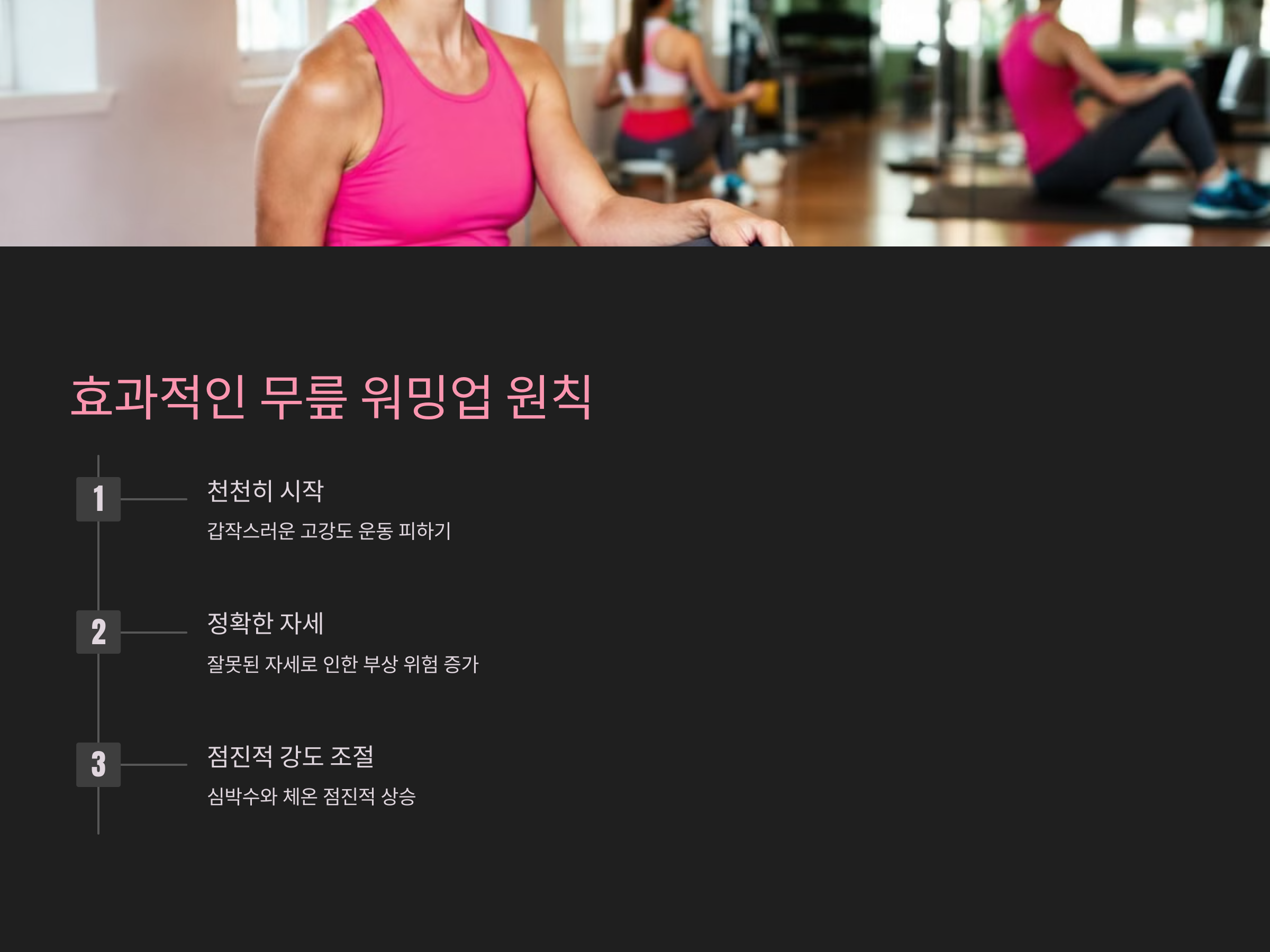 - 정확한 자세 유지: 잘못된 자세로 워밍업을 하면 부상 가능성이 오히려 증가합니다.