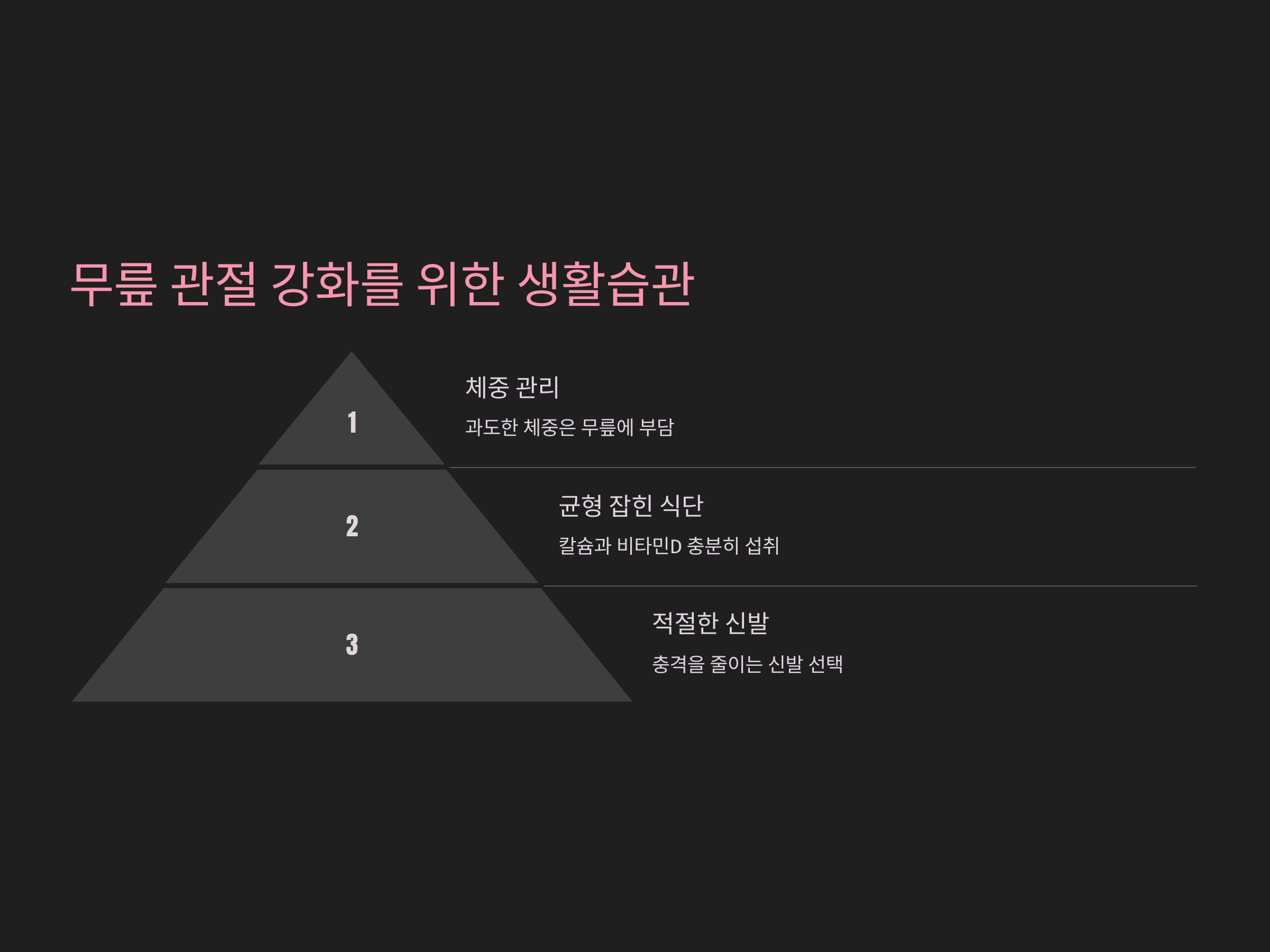 - 균형 잡힌 식단: 뼈와 관절 건강을 위해 칼슘과 비타민D를 충분히 섭취하세요.