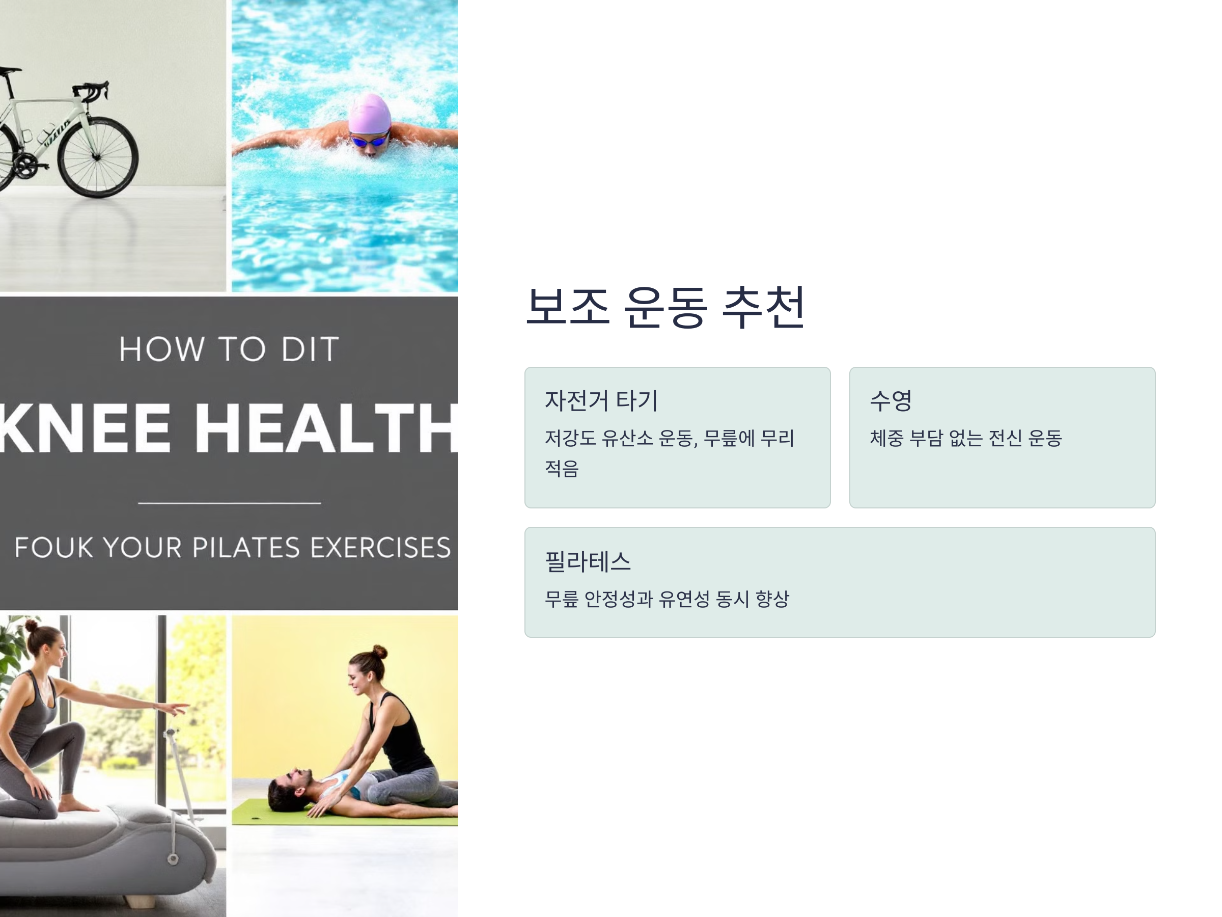 - 저강도 유산소 운동으로 무릎 관절에 무리를 주지 않으면서 강화.