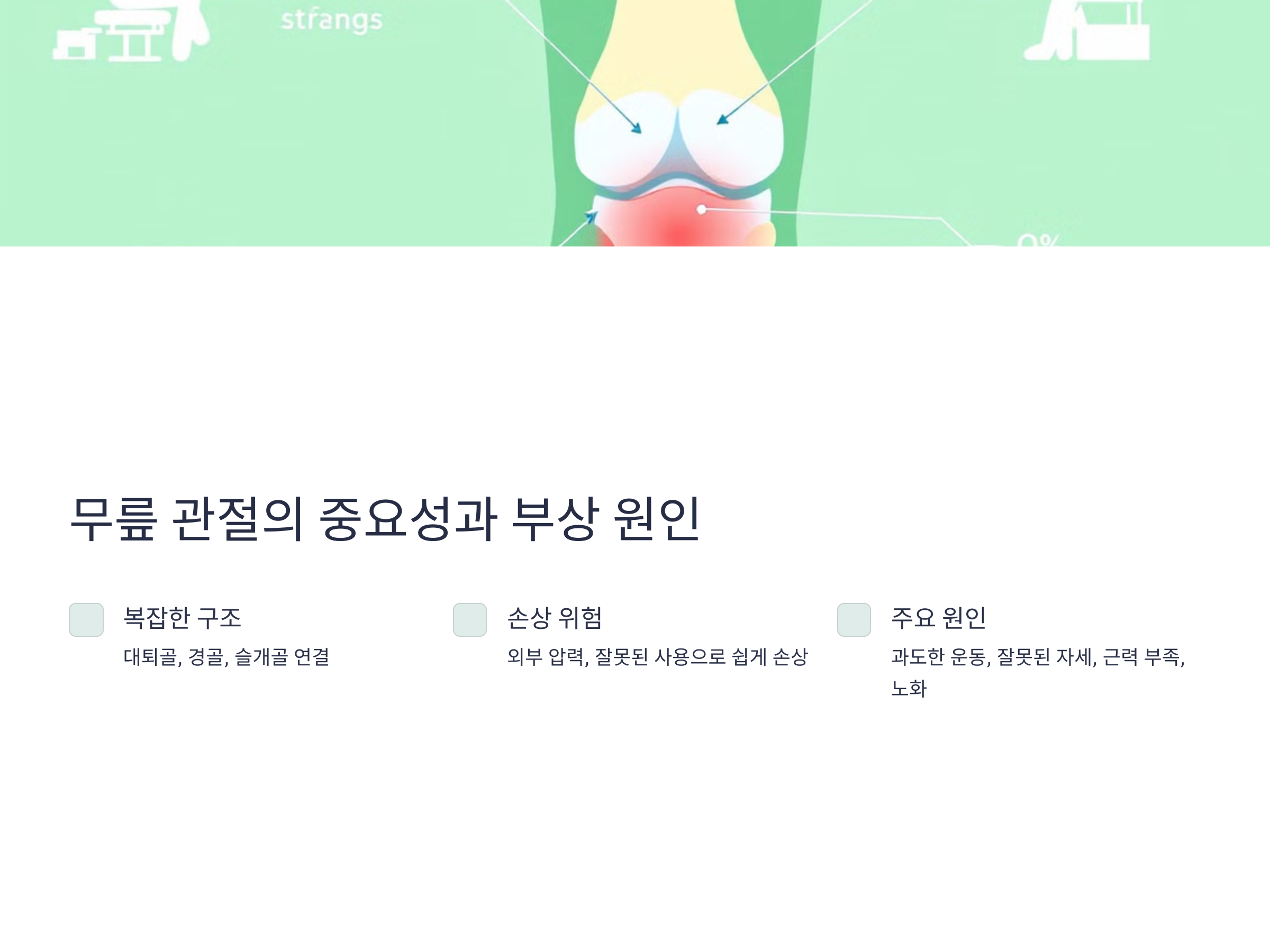 - 과도한 운동 및 무리한 동작: 무릎에 과도한 하중이 가해지면 관절 연골이 마모되거나 인대가 손상될 수 있습니다.