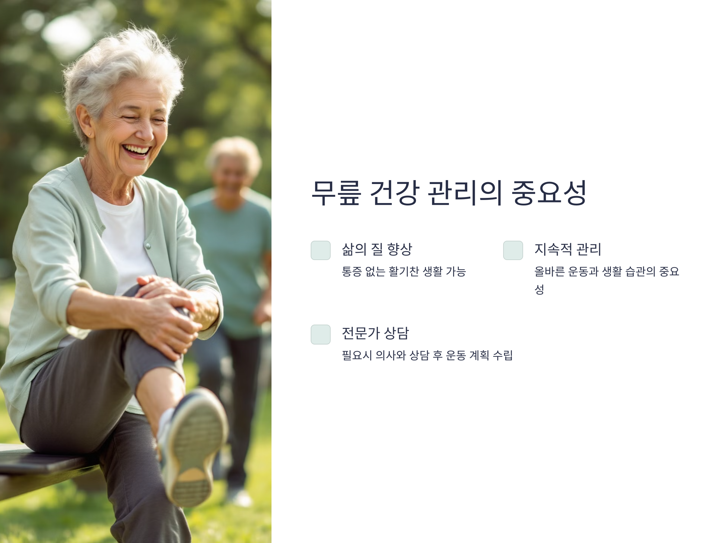 - 체중 관리: 적정 체중을 유지해 무릎에 가해지는 부담을 줄입니다.