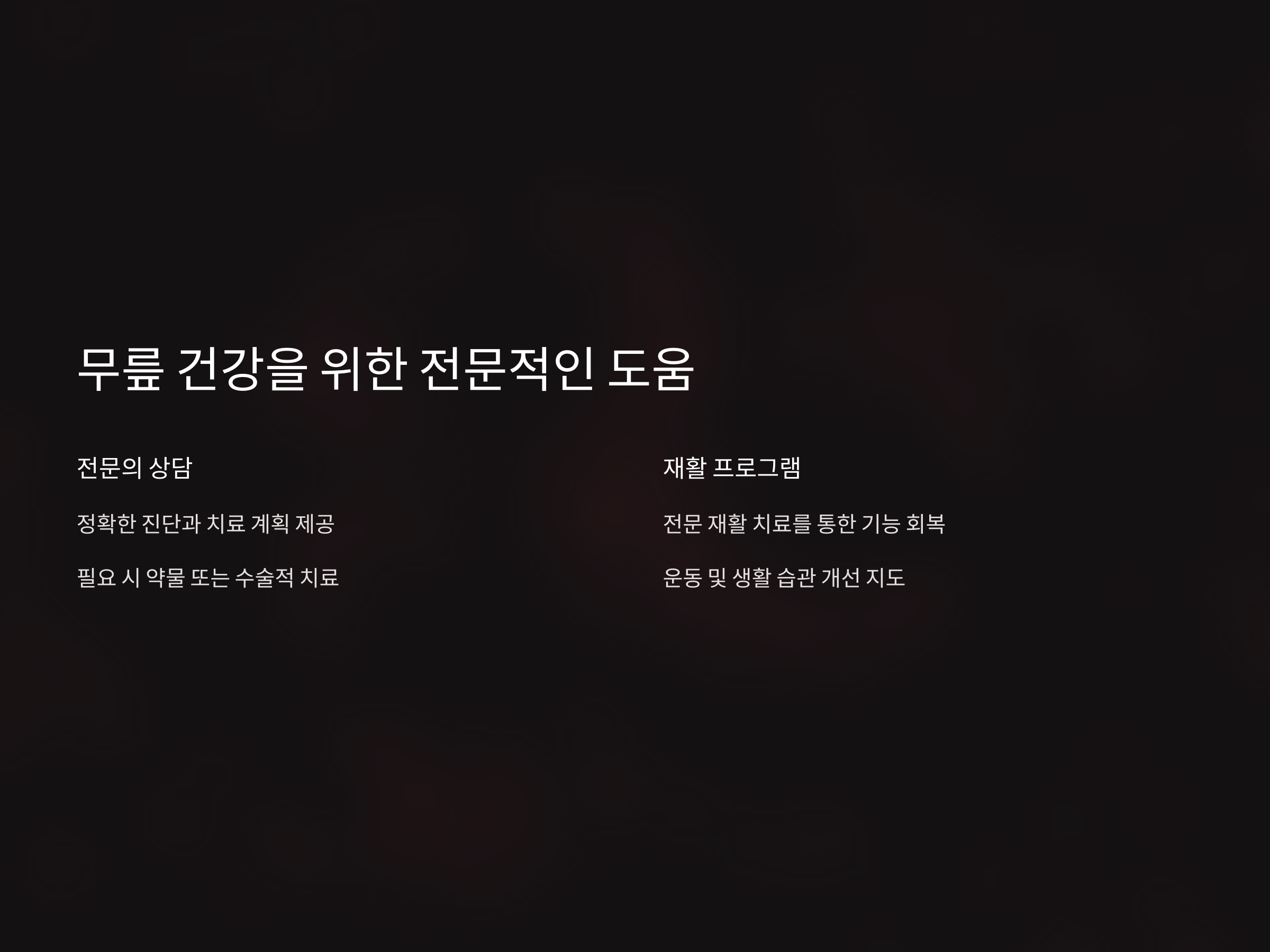 무릎 통증이 심하거나 관리가 어려울 경우 전문가의 도움을 받는 것이 가장 안전한 선택입니다.