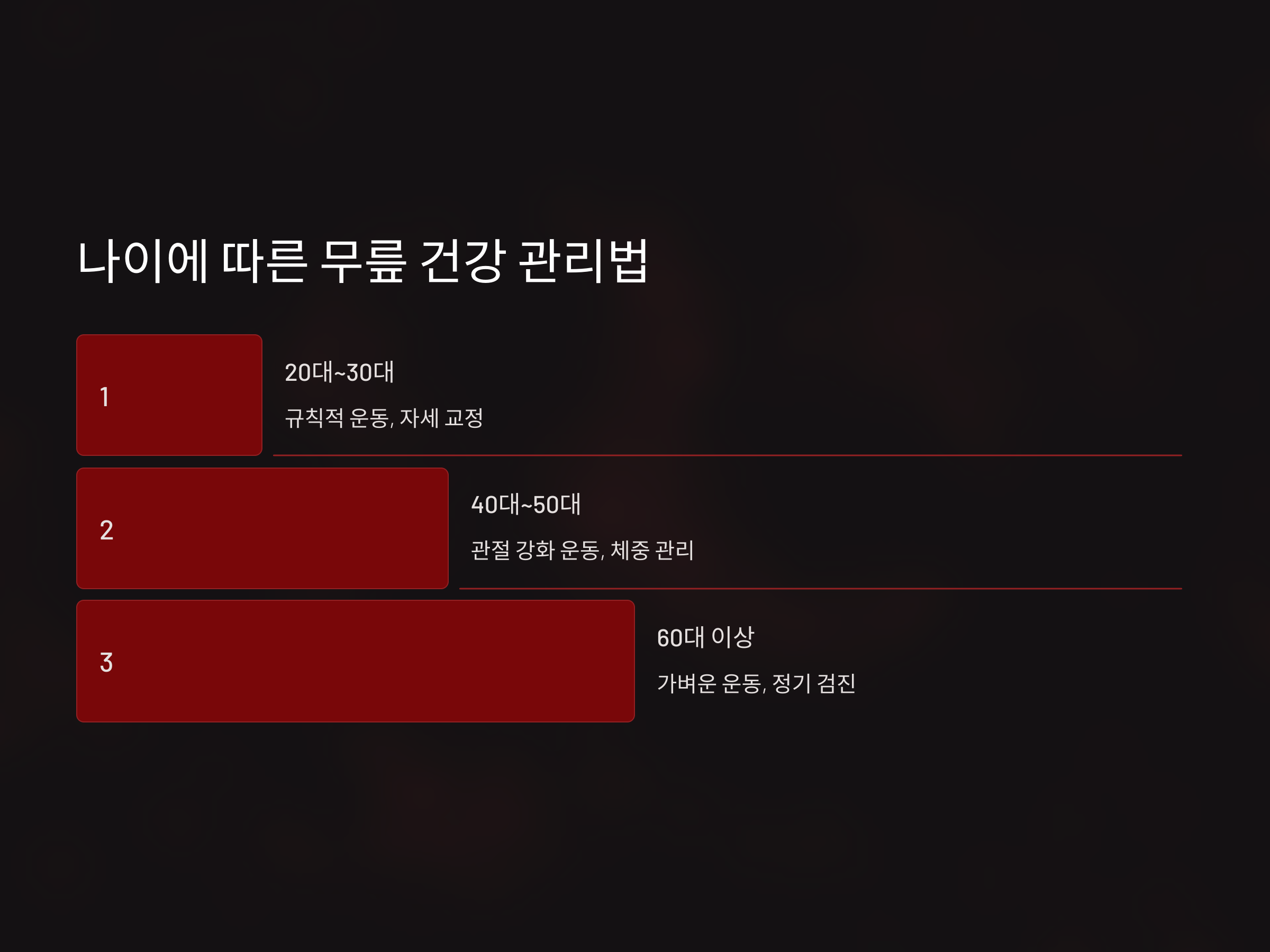 나이에 따라 무릎 관리 방법이 달라질 수 있습니다. 각 연령대에 맞는 관리법을 실천하세요.