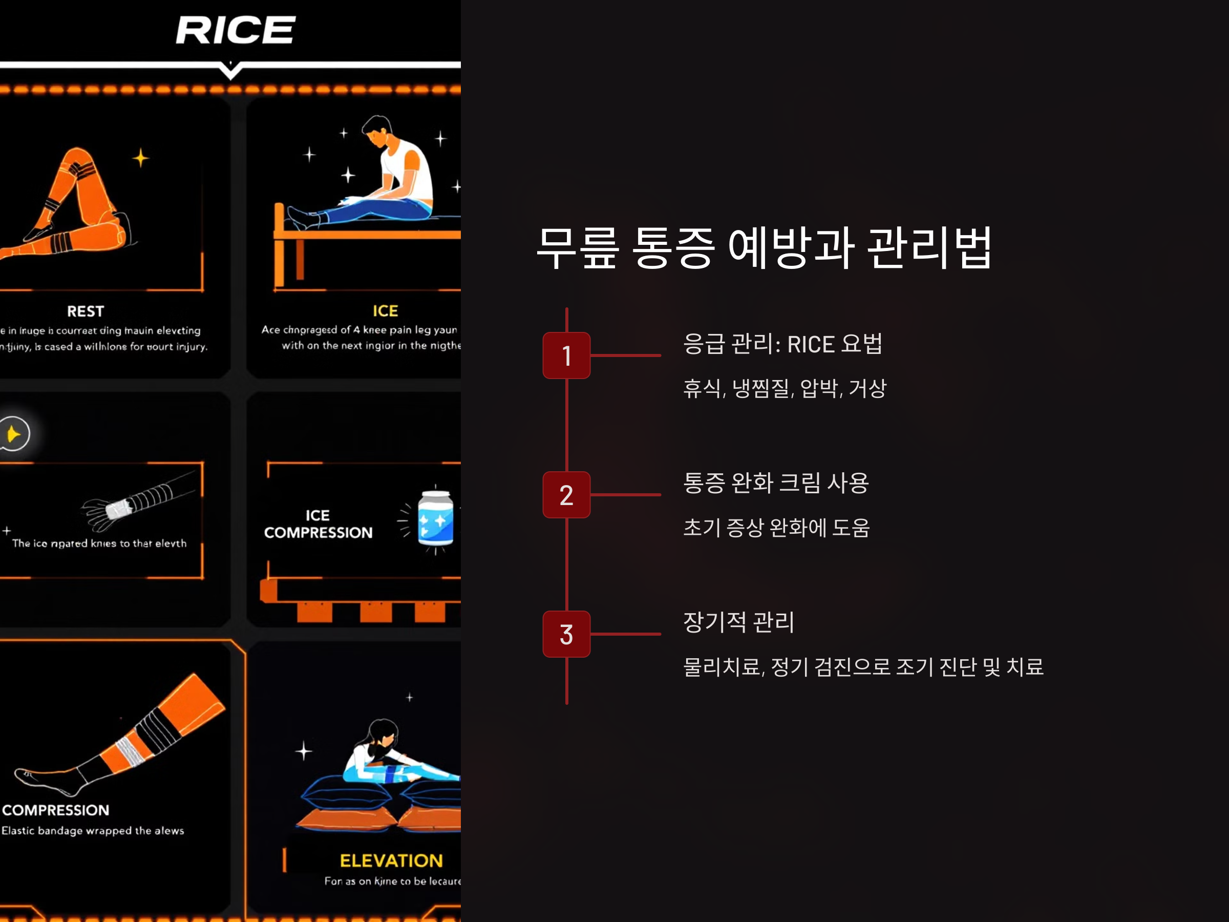 - RICE 요법: Rest(휴식), Ice(냉찜질), Compression(압박), Elevation(거상)