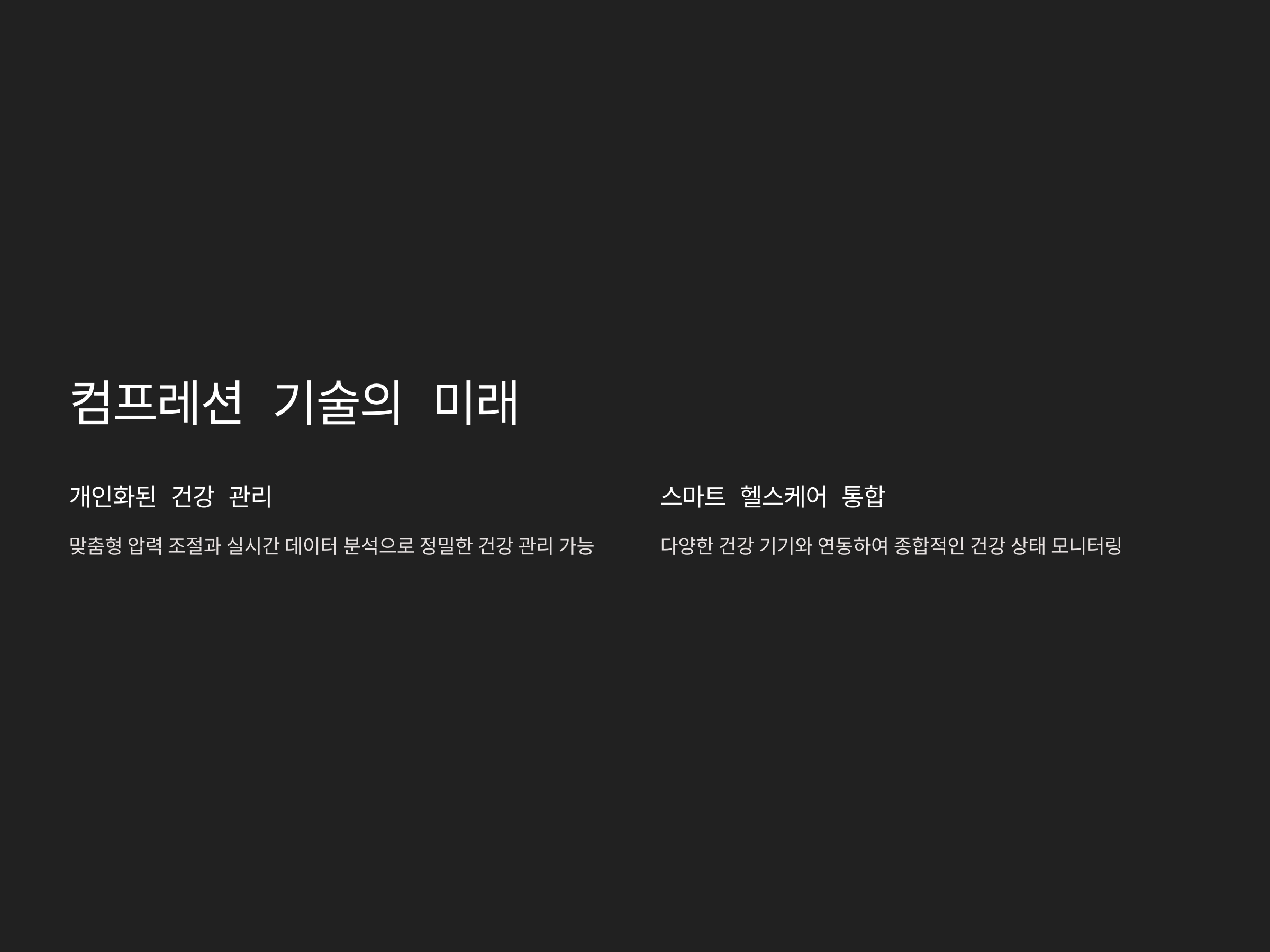 최근 컴프레션 기술은 스마트 헬스케어와 결합해 더욱 발전하고 있습니다. 센서를 내장한 컴프레션 제품은 다음과 같은 기능을 제공합니다: