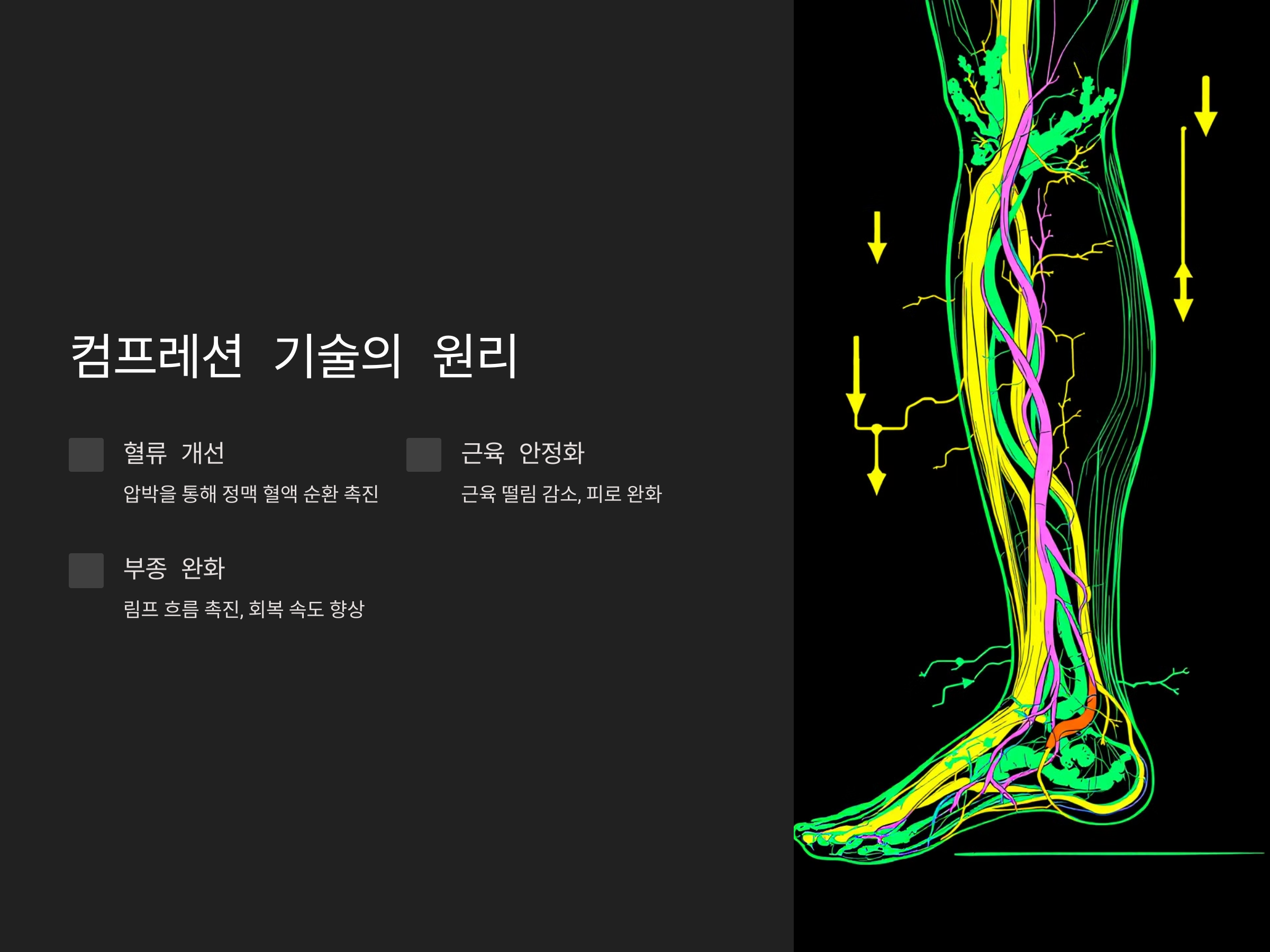 - 혈류 개선: 압박을 통해 정맥 혈액이 더 빠르게 순환하도록 도와 혈전 예방과 염증 감소에 기여합니다.