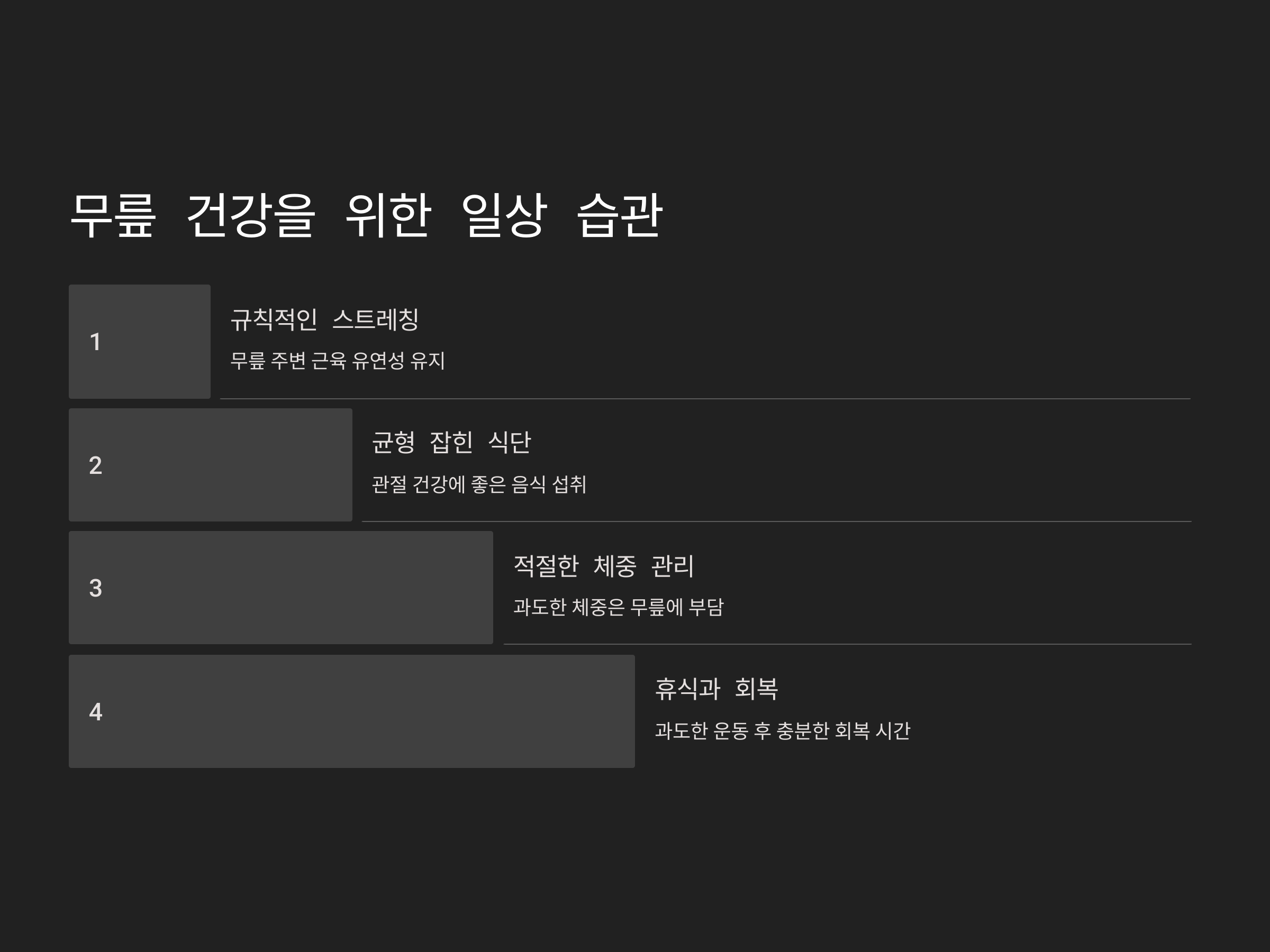 - 규칙적인 스트레칭: 무릎 주변 근육의 유연성을 유지하세요.