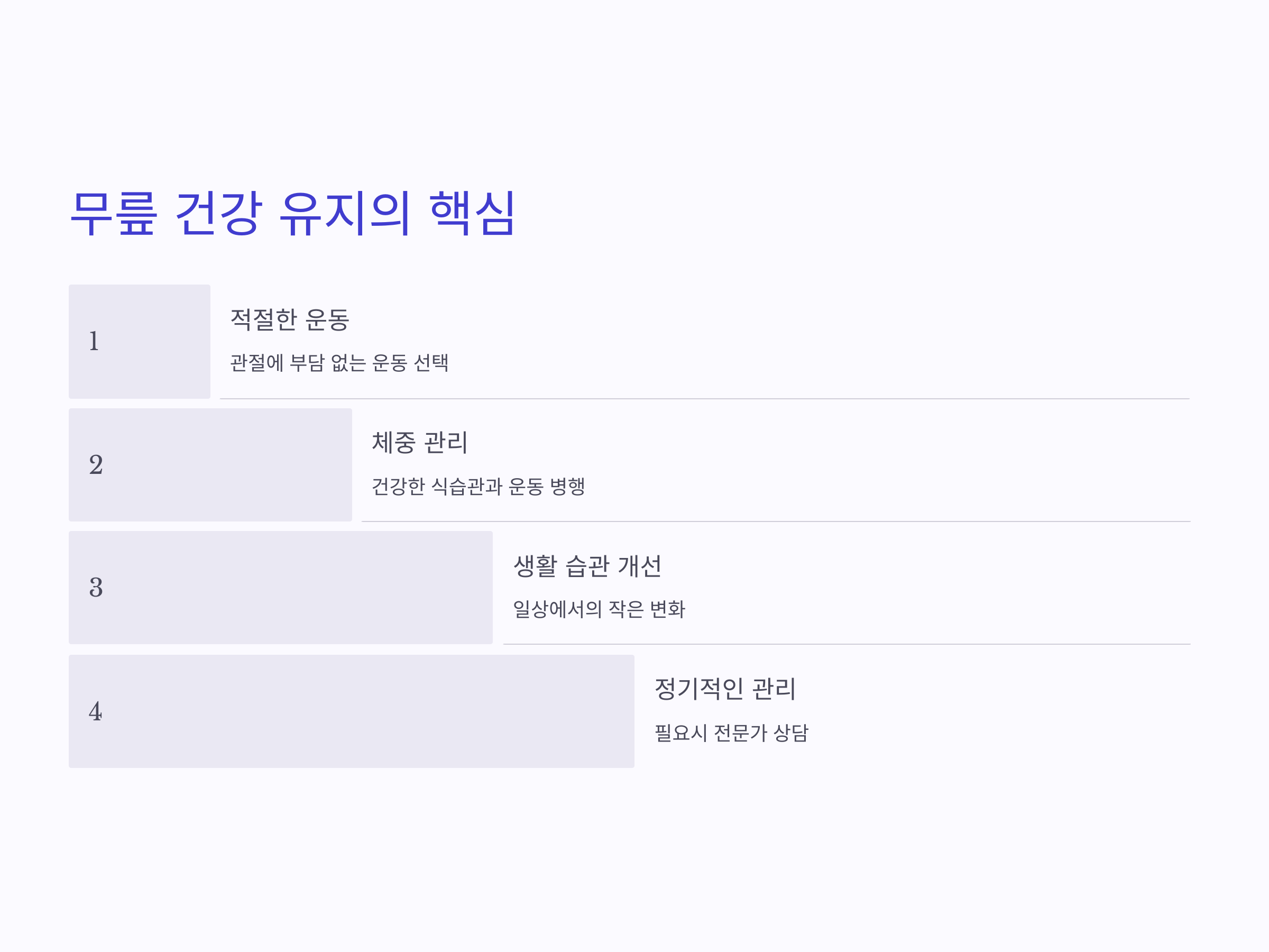 - 지속 가능한 운동: 체중을 줄이면서도 관절을 보호할 수 있는 운동 선택.
