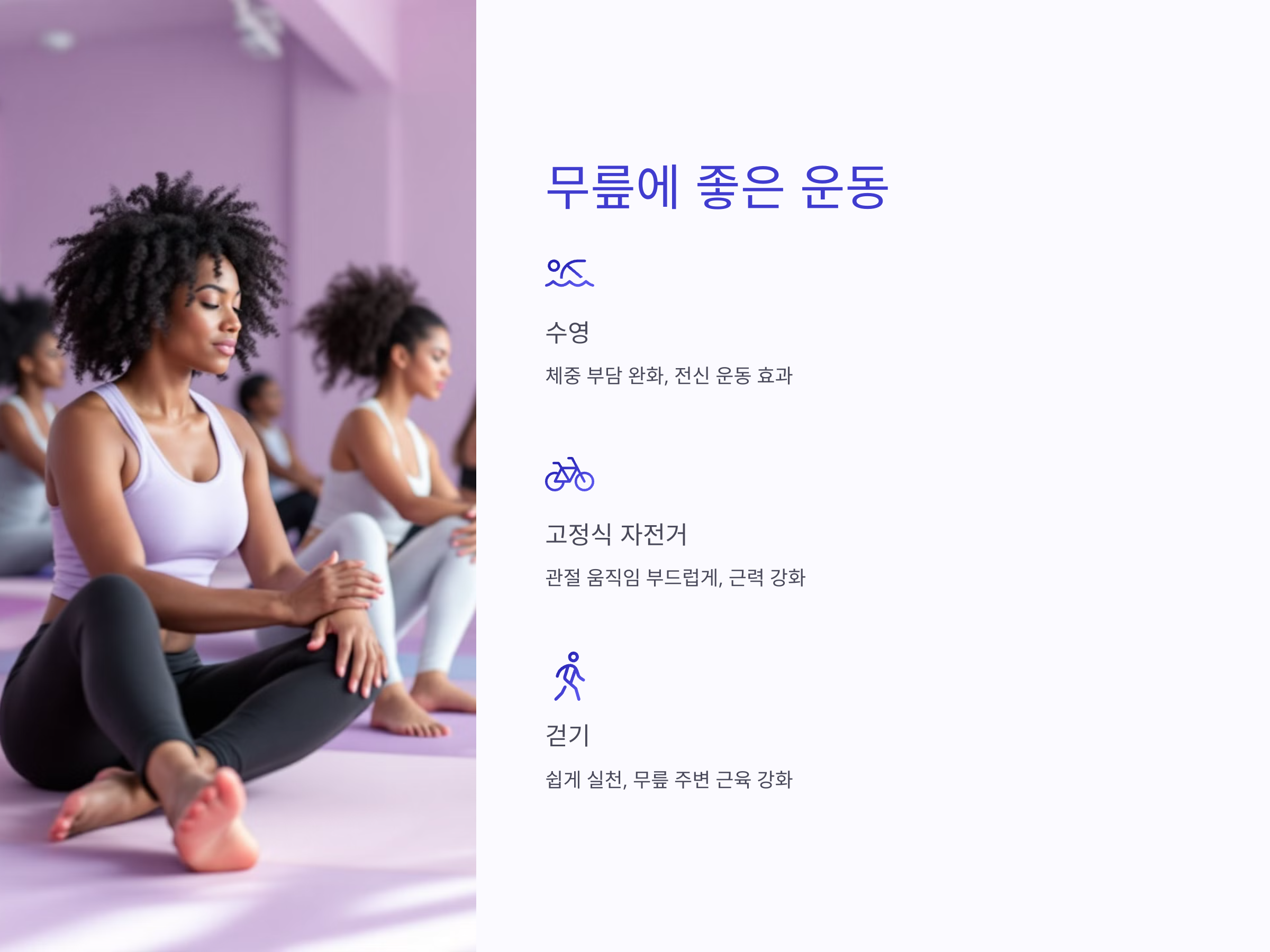 - 걷기: 일상생활에서 실천하기 쉽고, 무릎 주변 근육을 강화합니다.