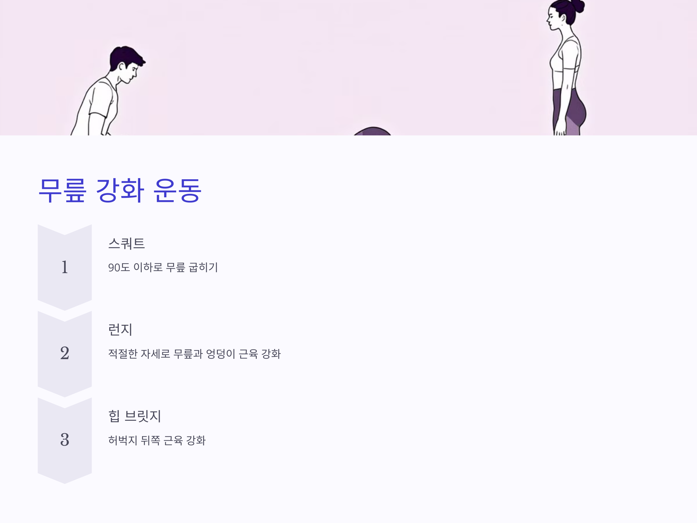 - 스쿼트(체중 스쿼트): 무릎을 굽히는 각도를 90도 이하로 유지하여 무릎 부담 최소화.